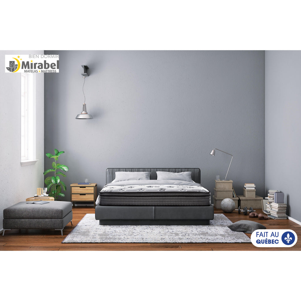 Matelas roulé à base de résine naturelle de plantes ainsi que de matières recyclées, offrant un confort plus moelleux. Tissu Harmony Charcoal™ est conçu pour offrir souplesse et bon confort. Matelas de 13". 3/4" de fibre de polyester. / 1/2" de mousse ondulée. Un Gelflex lombaire offrant un sommeil tout en fraîcheur et une réponse immédiate. 1 1/2" de mousse ondulée.3/8" de feutre isolant.Une rangée de 850 ressorts ensachés Perimax™. Chaque ressort répond indépendamment pour un confort individuel et ce, grâce à la bordure ferme de chaque ressort. Produit fait au Québec.