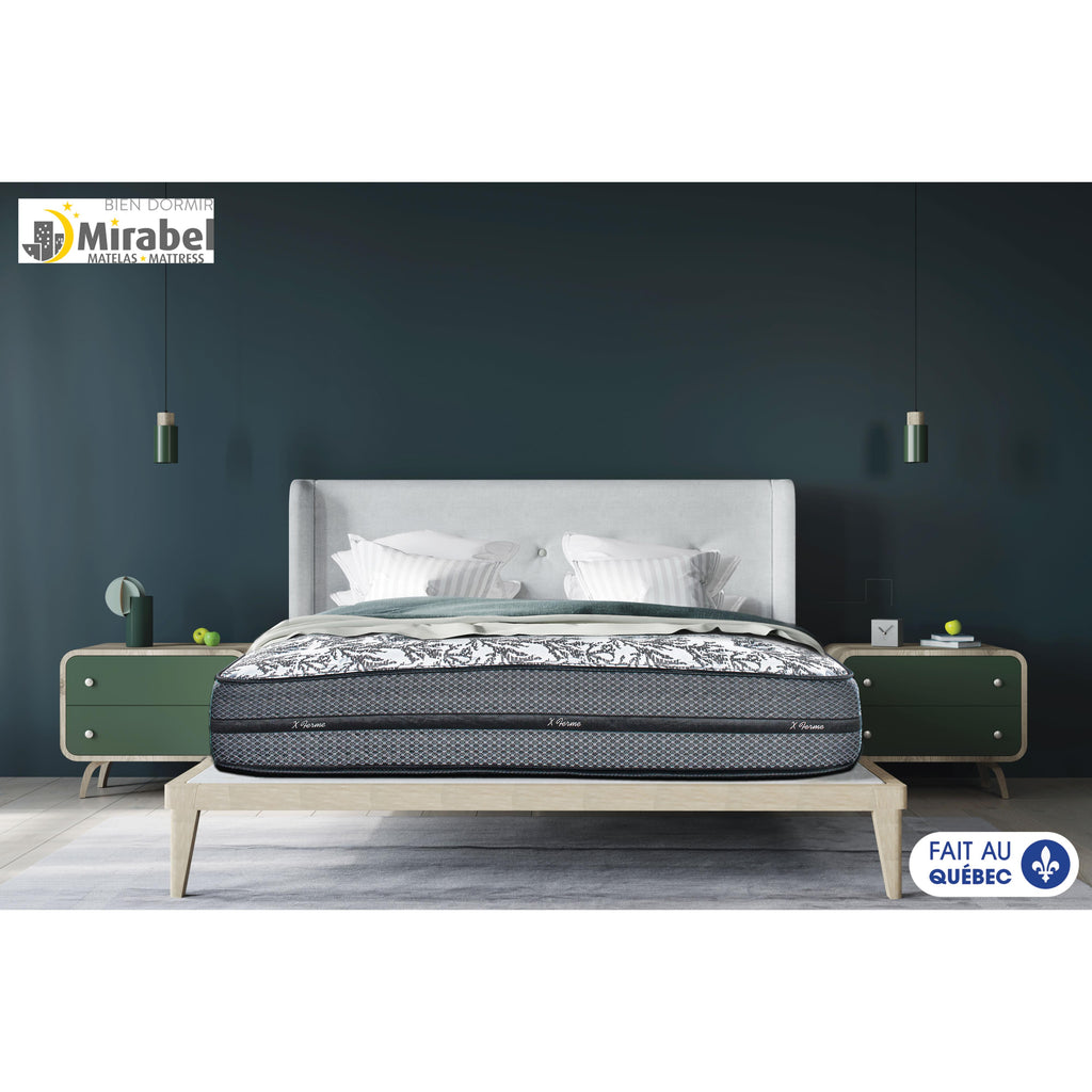 Matelas extra ferme à base de résine naturelle de plantes procurant plus de fraîcheur tout au long de votre sommeil. Tissu Louisiana™ offrant plus de fraîcheur au contact du corps tout au long de la nuit. 3/4" Fibre de polyester. 1 1/2" Mousse ondulée. 1/2" Nappe de mousse. Un Gelflex lombaire offrant un sommeil tout en fraîcheur et une réponse immédiate. 1 1/4" de mousse ferme haute densité et 7/8" d'isolant feutre. Une rangée de 983 ressorts ensachés répartis en 5 zones de fermeté, offrant un meilleur confort. Conçu dans un caisson de mousse, ce matelas vous offre un confort équilibré sur toute sa surface. Produit fait au Québec.Disponibilité du produit