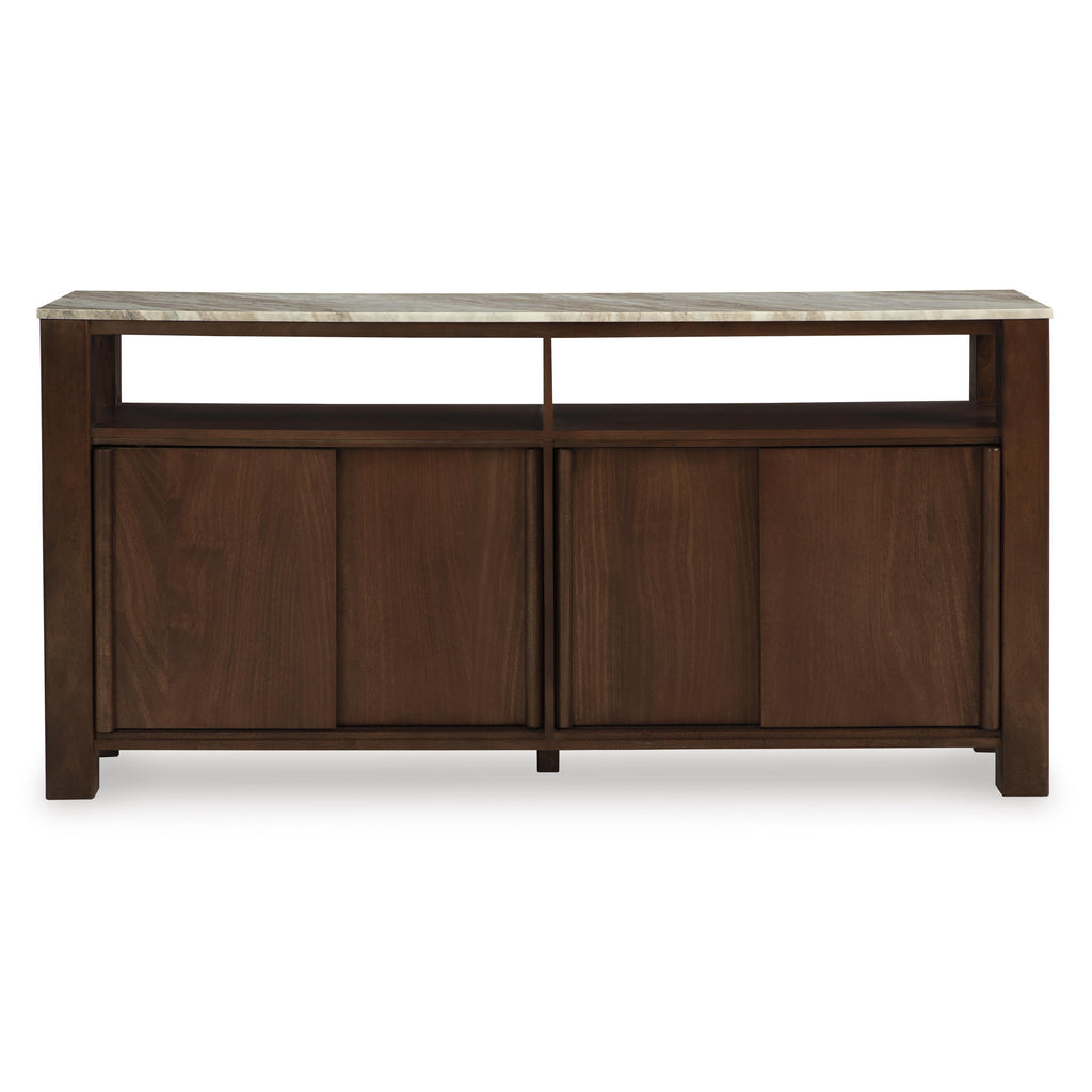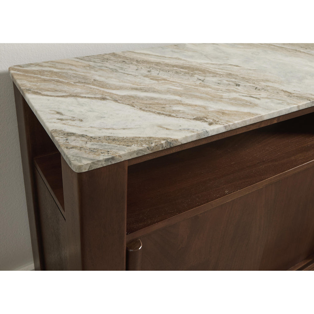 Style et fonctionnalité ? Vérifiez et vérifiez. Le dessus en marbre taupe, blanc et gris et la finition contrastante marron foncé de ce meuble d'appoint apportent un effet époustouflant. Les portes coulissantes s'ouvrent pour révéler des étagères parfaites pour cacher le désordre quotidien. Que vous l'utilisiez pour le rangement ou comme meuble TV, cette pièce maîtresse crée une élégance contemporaine en toute simplicité.
