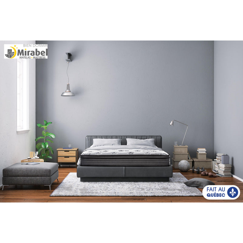 Rolled mattress made from natural plant resin and recycled materials, offering softer comfort. Harmony Charcoal™ fabric is designed for flexibility and good comfort. 13" mattress. 3/4" polyester fiber. / 1/2" corrugated foam. A Lumbar Gelflex offering a fresh sleep and an immediate response. 1 1/2" corrugated foam .3/8" insulating feltA row of 682 Perimax™ pocket coils. Each coil responds independently for individual comfort thanks to the firm edge of each coil. Product made in Quebec.