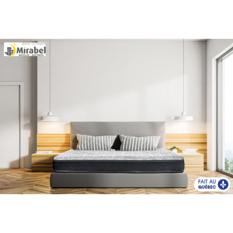 Miragel™ foam mattress provides freshness since it is not thermosensitive. Cluster Grey™ fabric offering great soft comfort. 2" Miragel™ foam offers a non-weight transfer advantage allowing your partner to sleep undisturbed, and its visco-elasticity allows for quick response to movement. 1" of gel foam makes you discover a soft comfort. 1 3/4" of 2lbs high density foam. 6" of 2lbs density foam with rigid edges. Product made in Quebec.Product availability