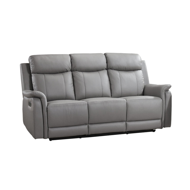 The classic look and evident comfort of the Cyrus reclining collection makes it a no-brainer for your contemporary living room. This motorized reclining sofa features dual side-mounted control buttons that adjust the power footrests for the ultimate flexibility of comfort positioning that is sure to please everyone in your household. The seat front is covered in authentic cowhide leather upholstery on every surface that touches your skin, while cost-effective high quality PVC-match fabric finishes off the sides and back, all in a handsome light grey colour. Stitch detailing offers subtle visual interest for a tailored appearance just as padded pillowy arms, a generously stuffed headrest, and comfortable no-sag seat construction cradle your body supportively. The Cyrus truly is the perfect marriage of modern functionality and timeless style. Also available as a non-power reclining sofa.