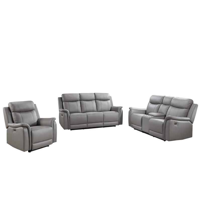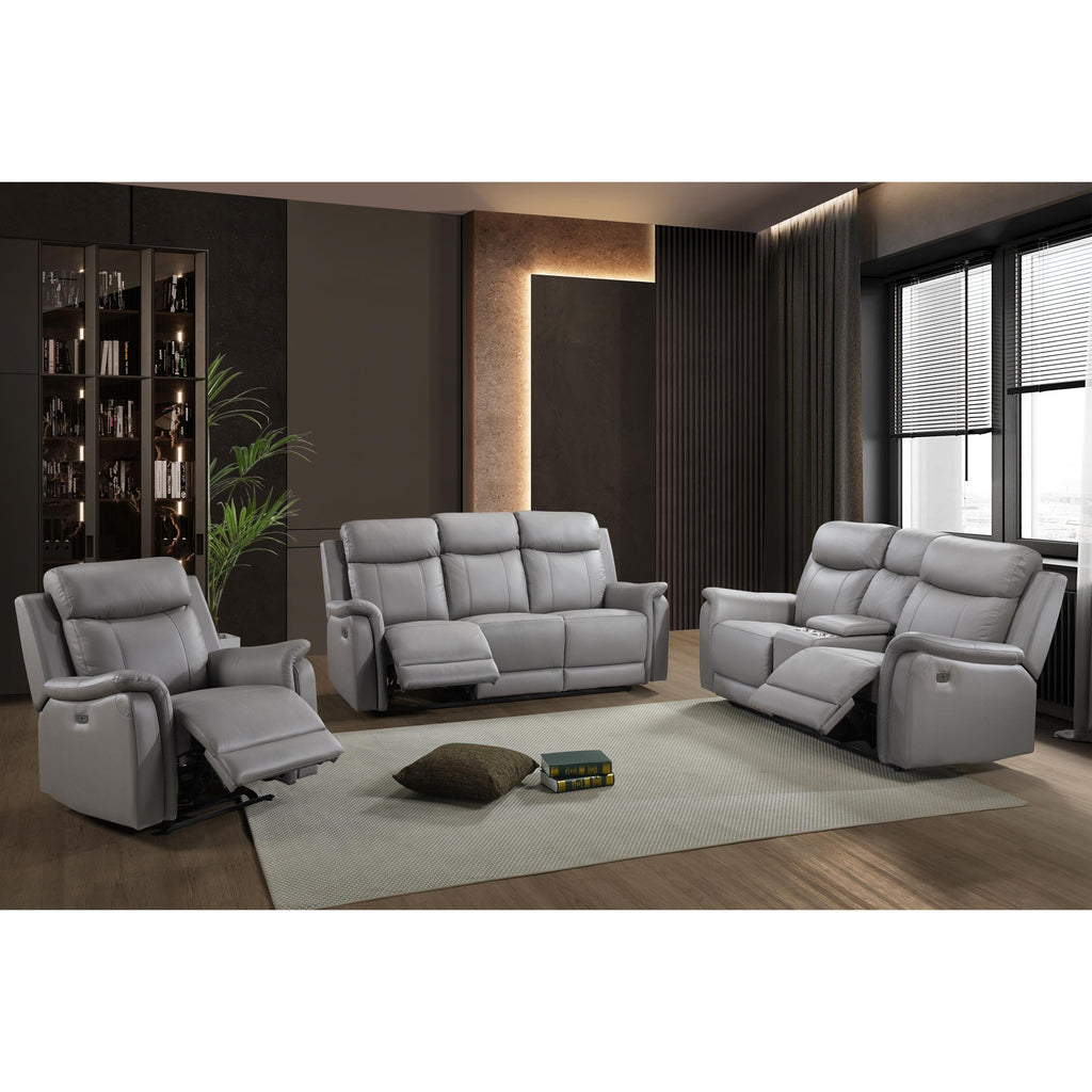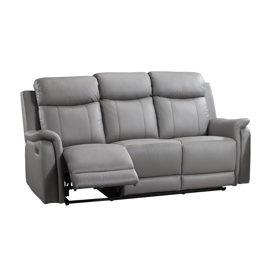 The classic look and evident comfort of the Cyrus reclining collection makes it a no-brainer for your contemporary living room.... The classic look and evident comfort of the Cyrus reclining collection makes it a no-brainer for your contemporary living room. This motorized reclining sofa features dual side-mounted control buttons that adjust the power footrests for the ultimate flexibility of comfort positioning that is sure to please everyone in your household. The seat front is covered in authentic cowhide leather upholstery on every surface that touches your skin, while cost-effective high quality PVC-match fabric finishes off the sides and back, all in a handsome light grey colour. Stitch detailing offers subtle visual interest for a tailored appearance just as padded pillowy arms, a generously stuffed headrest, and comfortable no-sag seat construction cradle your body supportively. The Cyrus truly is the perfect marriage of modern functionality and timeless style. Also available as a non-power reclining sofa. View more