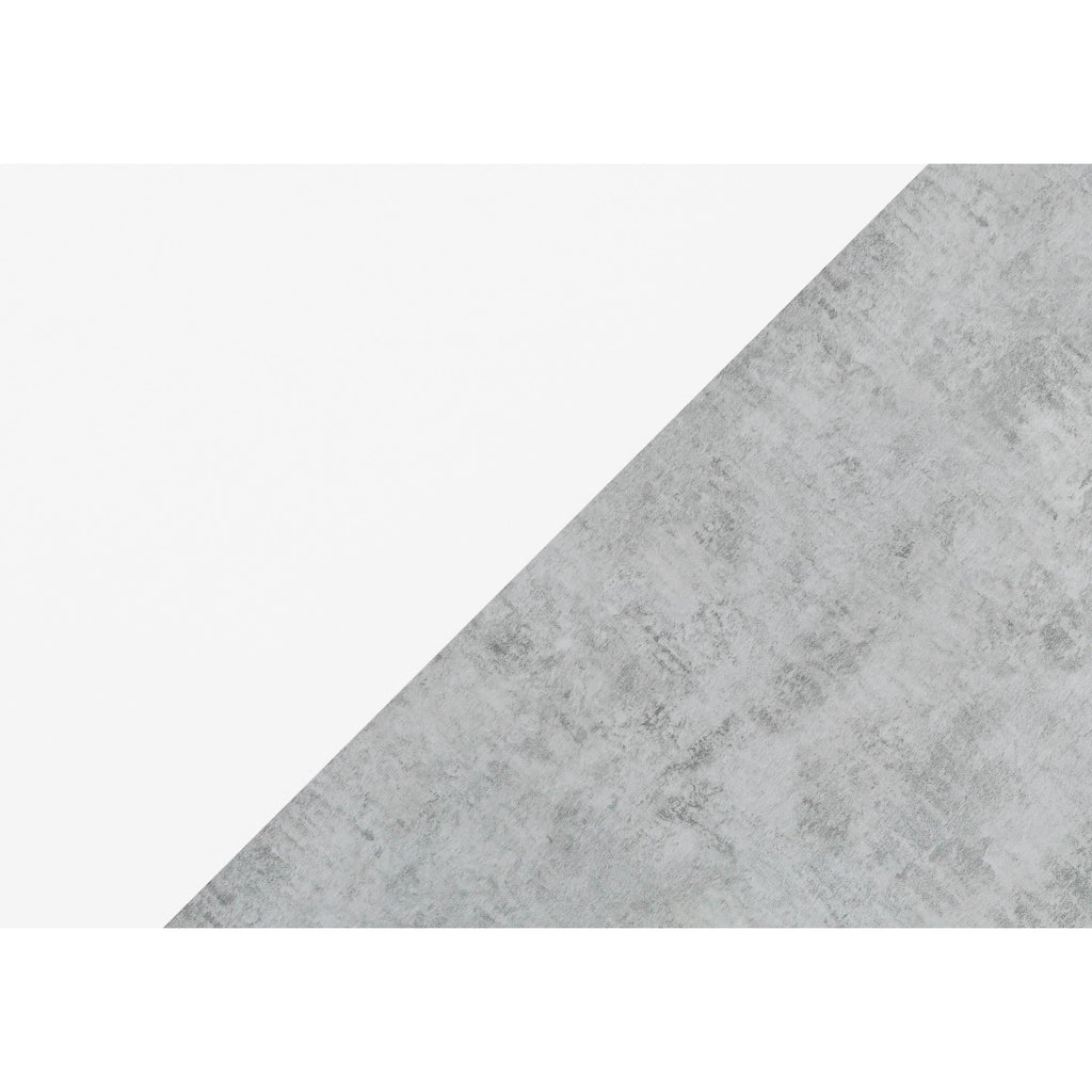 • Unique combination of a bright white finish topped by a distinctive grey cement-look finish and accented with sleek, angled legs and a stylish cup pull cabinet door handle in grey metal
