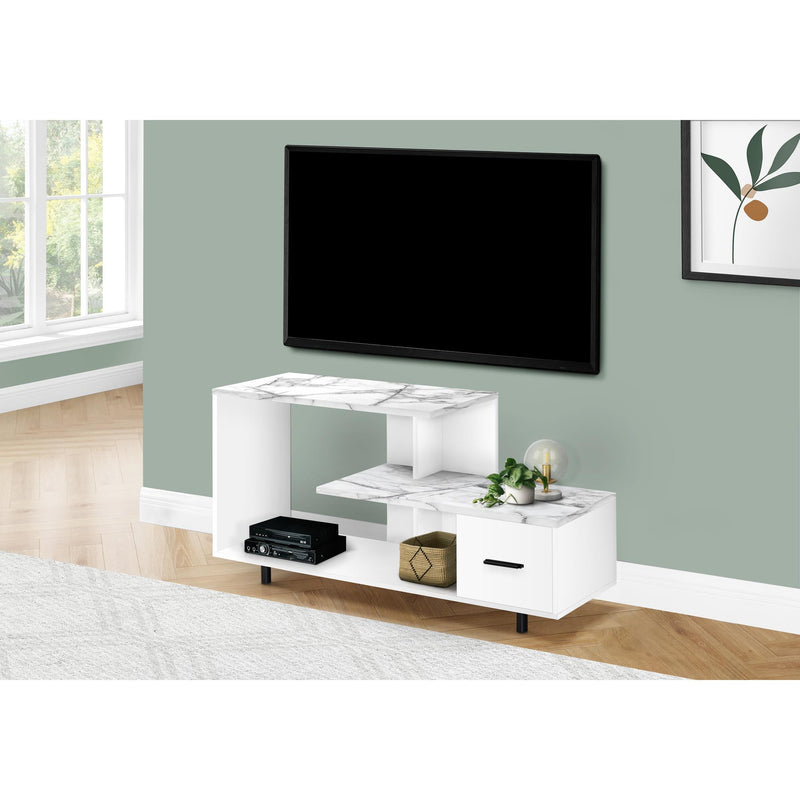 Enhance the look of your living space with the contemporary styling of this Art-Deco inspired tv stand. This white with white marble top entertainment console with sturdy round metal legs, features open concept shelving and one drawer ideal for media storage solutions. This console unit accommodates all TV sizes with a center stand and will be a stand out in your living room, family room, den, or basement space.
