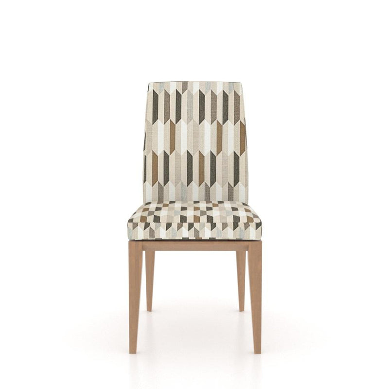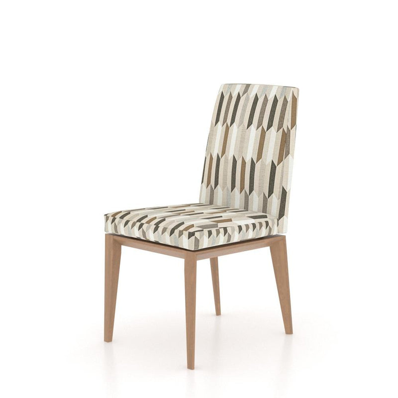 This elegant upholstered chair with a high back stands out for its unique design and attention to detail, as well as for its high-quality finish. Customize your dining room with a wide selection of fabrics and woods. Made in Quebec by Canadel.