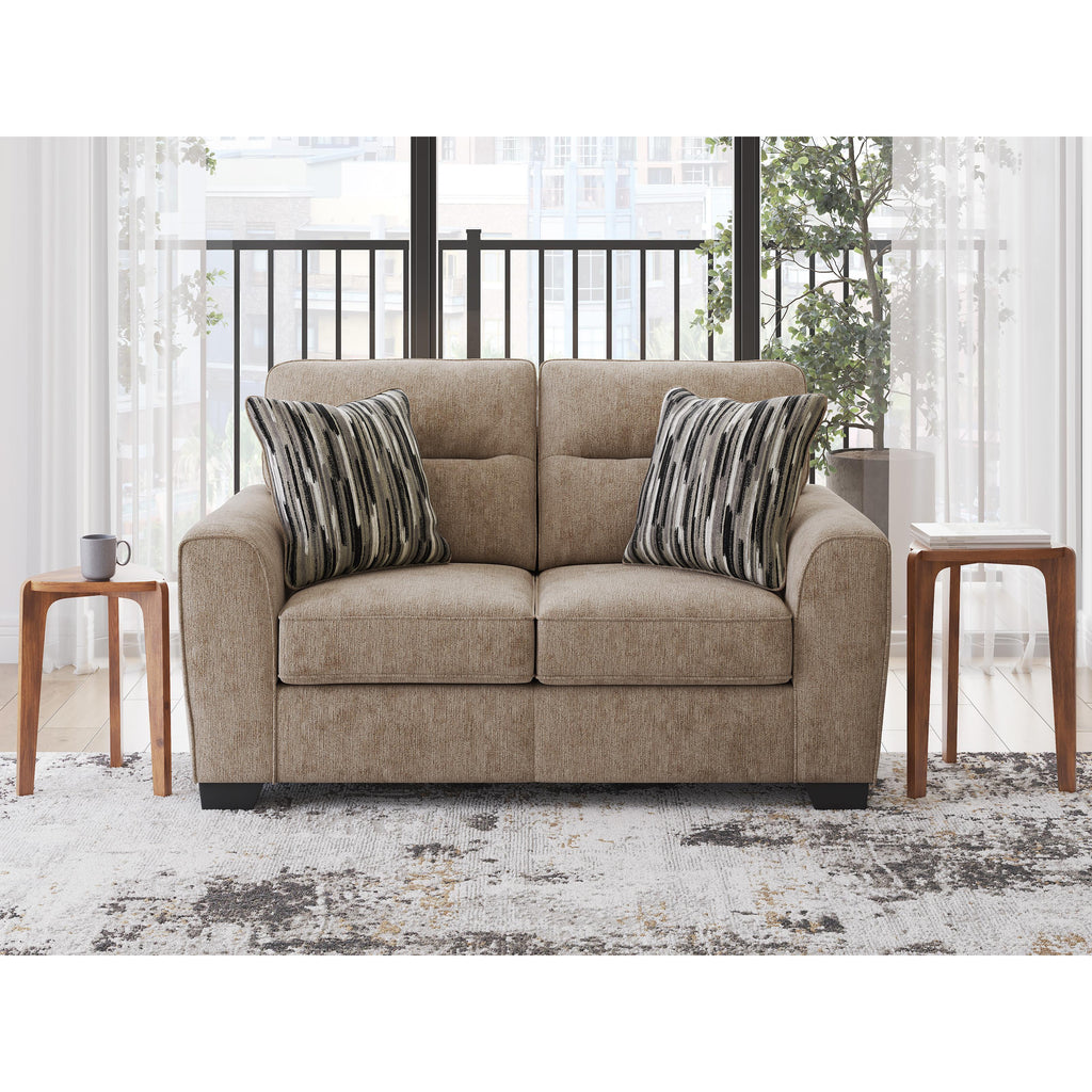 Strike a balance between the indulgent comfort you crave and the contemporary aesthetic you long for. The fabulously soft, mocha-colored... Strike a balance between the indulgent comfort you crave and the contemporary aesthetic you long for. The fabulously soft, mocha-colored upholstery of this loveseat takes neutrals to new heights. Plus there's plenty of room to spread out and relax solo or with your bestie. Geometric-patterned accent pillows perfect the richly on-trend aesthetic. View more