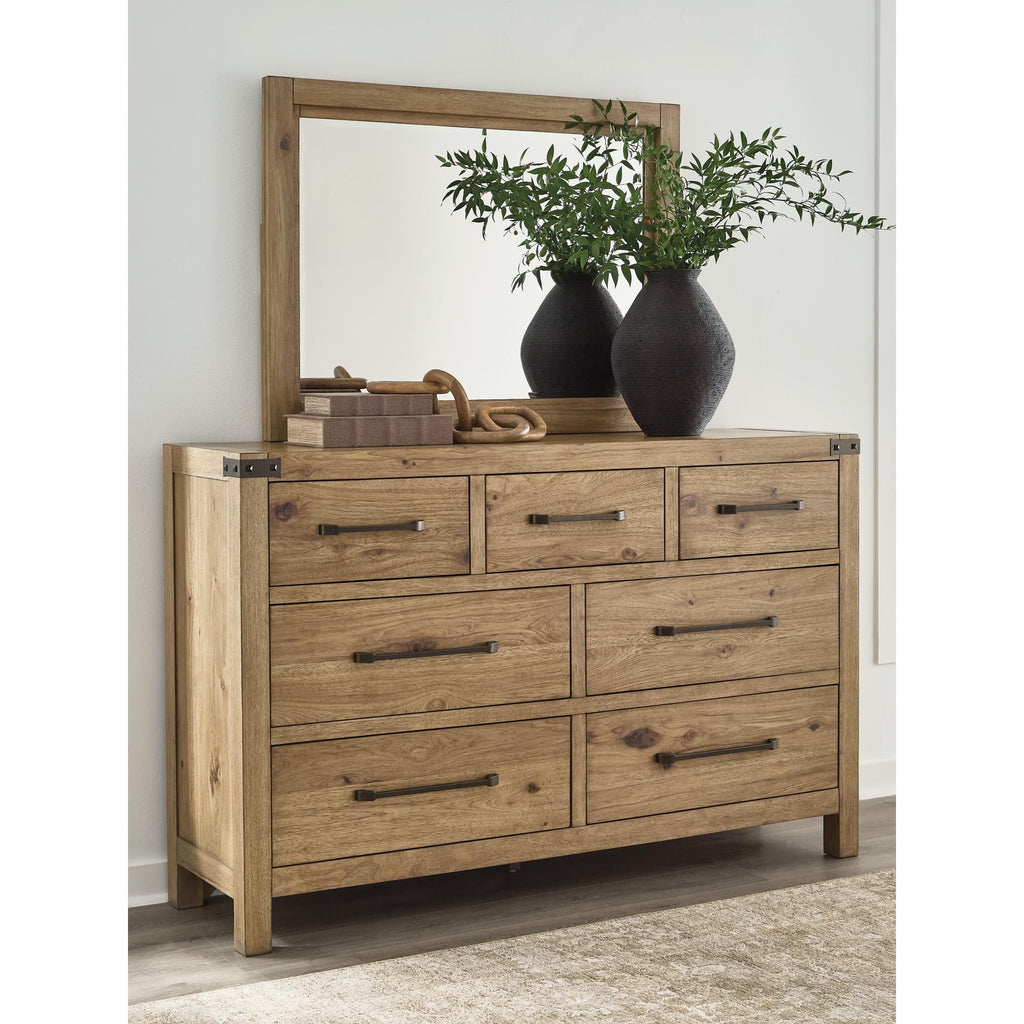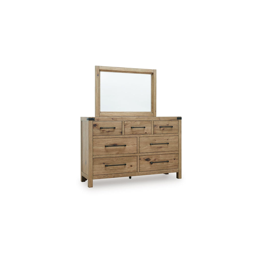 Rustic character with a dash of refinement. Outfitted with stunning hickory veneer and completed with a natural finish, this dresser with mirror celebrates the authentic beauty of wood. Its sturdy silhouette, complete with a thick top and posts, lends a substantial, luxurious weight to the look. Metal accents introduce an industrial-inspired flair.