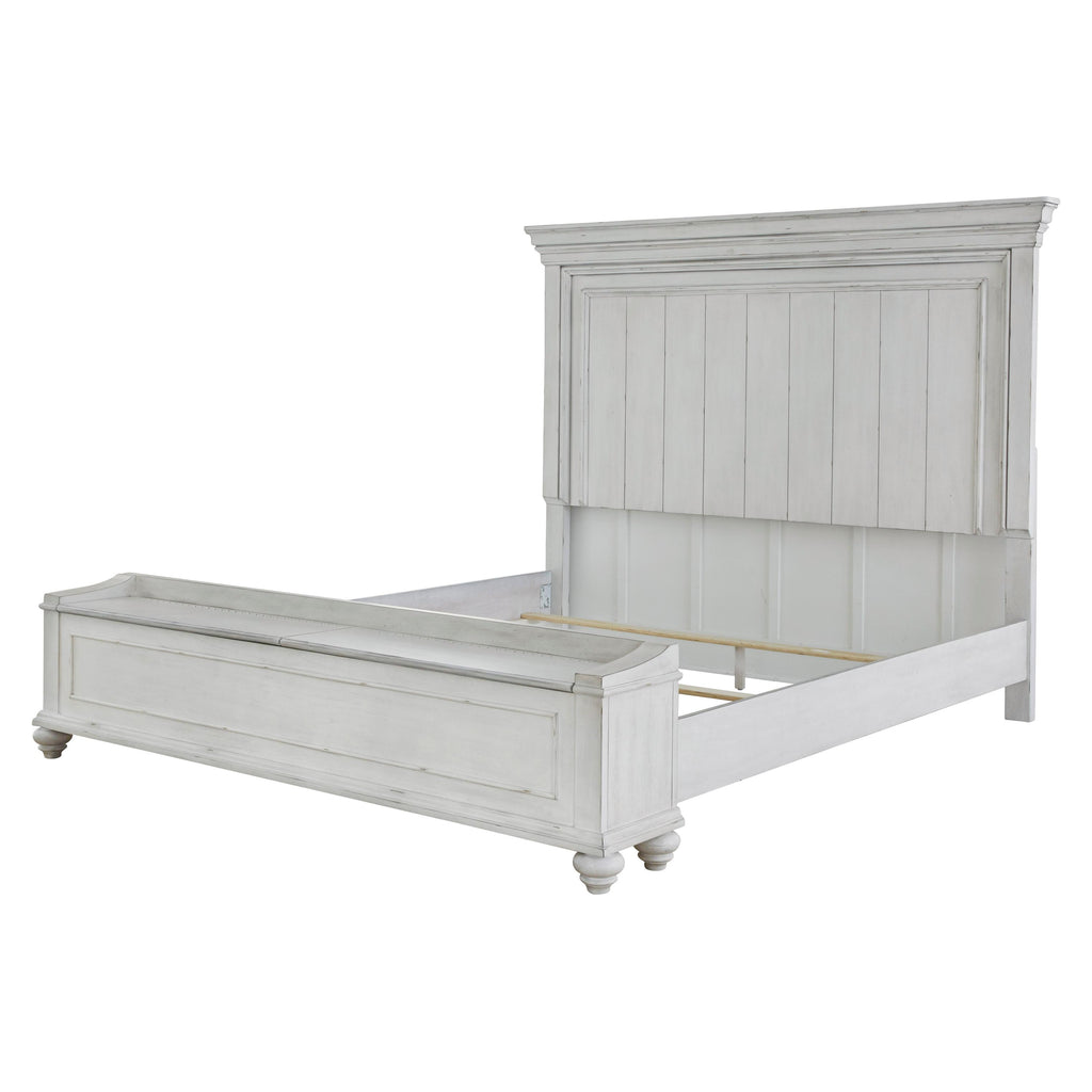 Give your retreat vintage charm with this king panel bed and storage footboard. In a beautifully distressed whitewash finish, you'll love the headboard's grand style featuring a picture framed panel. The bench footboard is equally elegant offering extra storage and a convenient seat. Generously scaled moulding from top to bottom, along with bun feet give this bed character—evoking the feel of a quaint cottage escape.