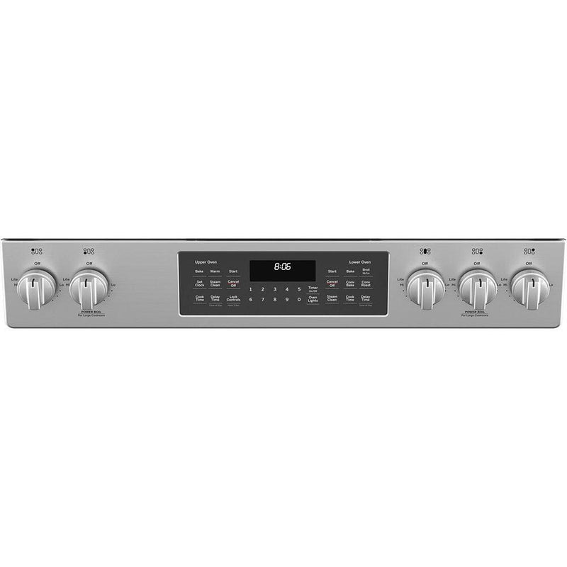 This 30-inch wide GE double oven gas range features True European Convection, steam clean, 5 cooktop burners and a total capacity of both ovens of 6.7 cu.ft.