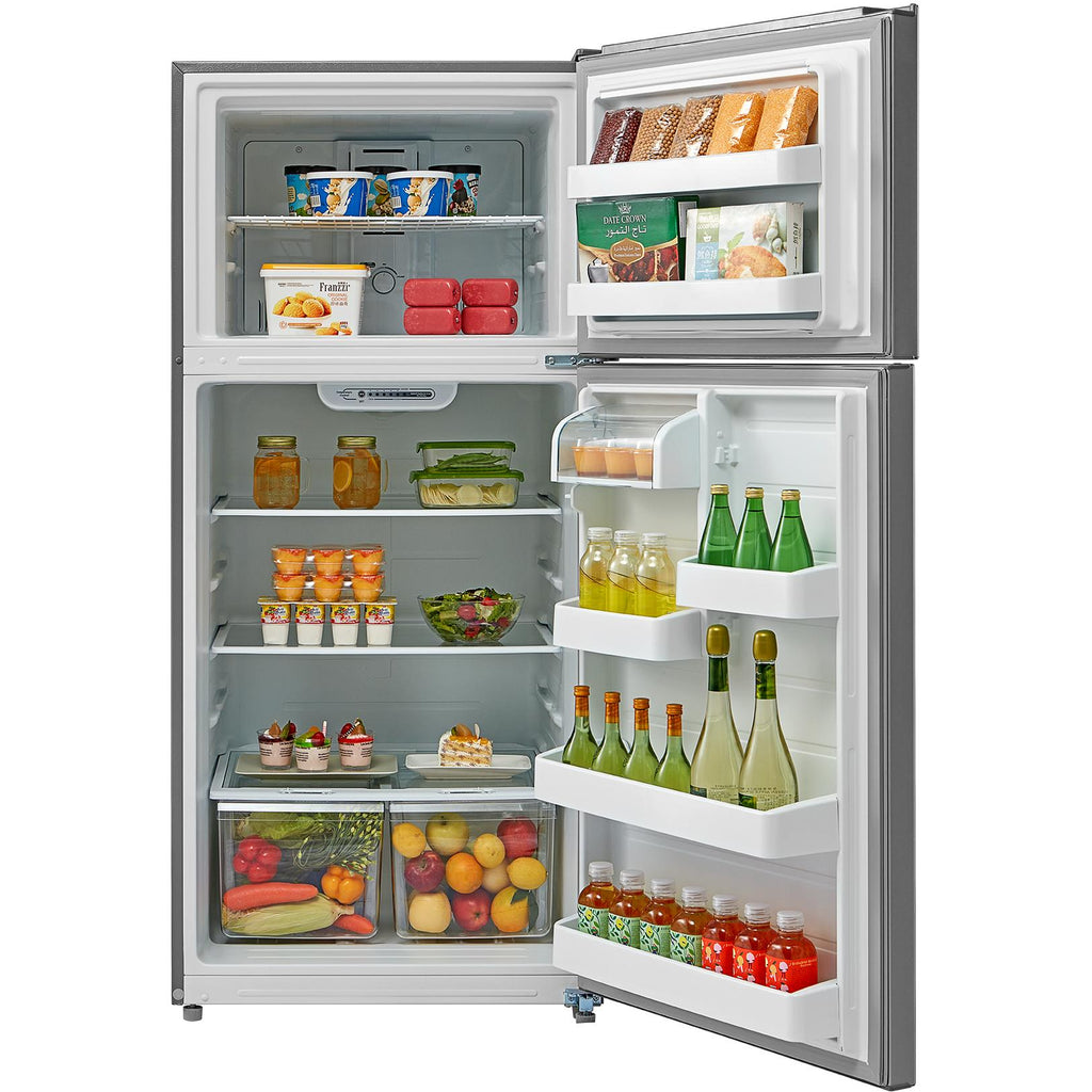 This GE 18 cu. ft. top-freezer no-frost refrigerator features upfront temperature controls, 4 adjustable bins, 2 full-width glass shelves, 2 adjustable-humidity drawers and LED Lighting.