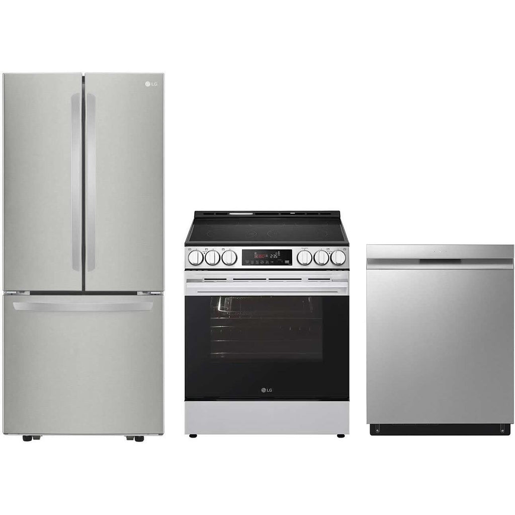 Upgrade your kitchen with this LG 3-piece appliance package. The 21.8 cu. ft. French 3-door refrigerator features SmartCooling Plus™, SmartDiagnosis™,... Upgrade your kitchen with this LG 3-piece appliance package. The 21.8 cu. ft. French 3-door refrigerator features SmartCooling Plus™, SmartDiagnosis™, and Spill Protector™ glass shelves for precise, even cooling. The 6.3 cu. ft. Smart Wi-Fi Slide-In Range with Air Fry and EasyClean® delivers flexible cooking with dual elements and convenient smart features via the ThinQ® app. Completing the set, the 24" top control dishwasher with QuadWash™ and Dynamic Dry™ ensures thorough, efficient cleaning for every load. View more