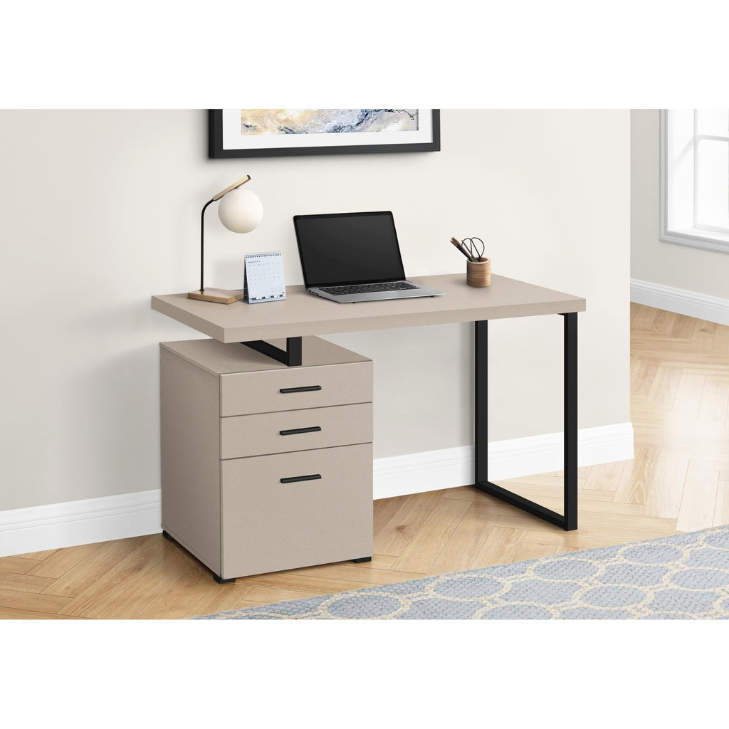 • Drawer handles, desktop support, and sturdy U-shaped metal leg are in a contrasting black finish