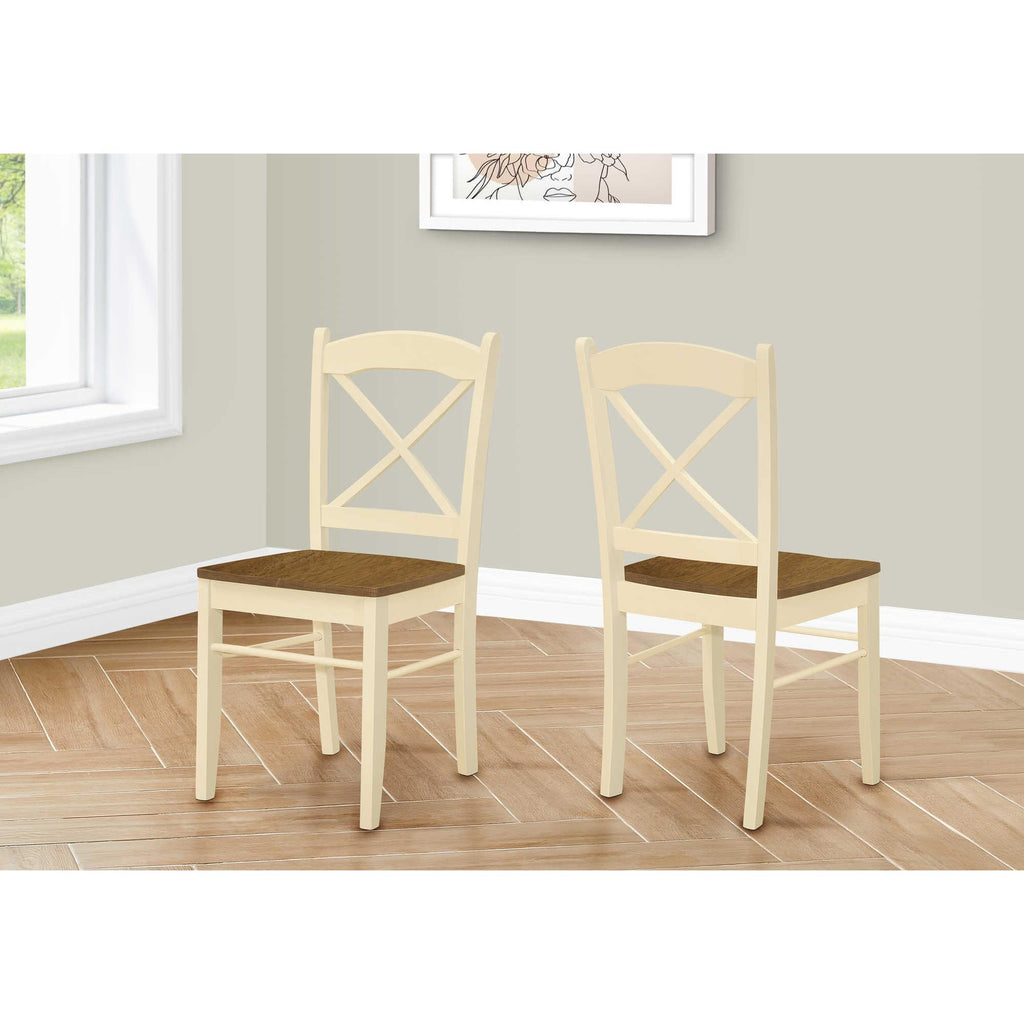Get ready to re-fresh your dining room or kitchen with this set of 2, solid wood transitional-style dining chairs. Finished in a high-quality, smooth cream finish with a cross-back design, these armless chairs perfectly accompany a casual dining area without compromising style. The scooped, oak finish wooden seats on these versatile side chairs are subtly contoured for comfort with a sturdy frame and wood legs for support. The timeless design of these chairs makes them effortless to place at a kitchen or dining table for everyday use or as accent chairs in a family room, bedroom, library, or study. Easy to assemble, spruce up your home with this set of 2 chairs to provide years of lasting use.
