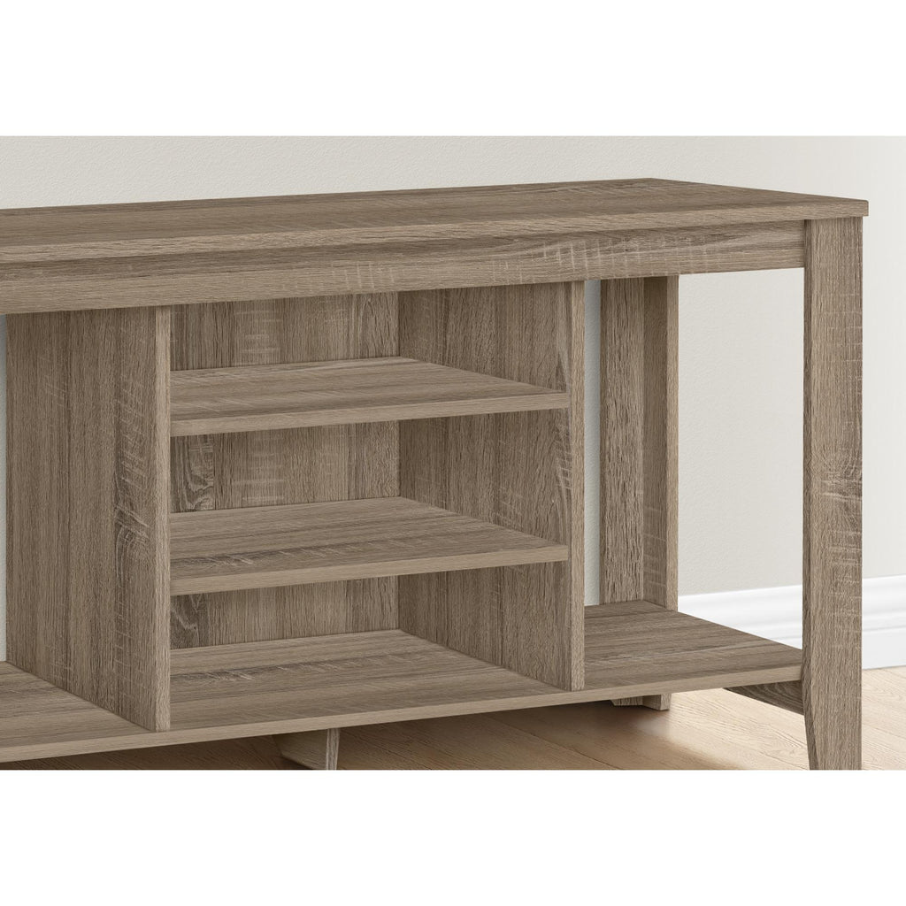 This simplistic and transitional style TV stand fits nicely in your living room or games room, saving space in tighter areas and adding style with its dark taupe wood-look finish. Including two adjustable center shelves, the entertainment center also features an additional bottom shelf, two larger side shelves and a solid base, allowing you to display all sorts of audio/video components and decor items. Accommodating all TV sizes equipped with a center stand, this media console adds character to your small home, apartment or condo.