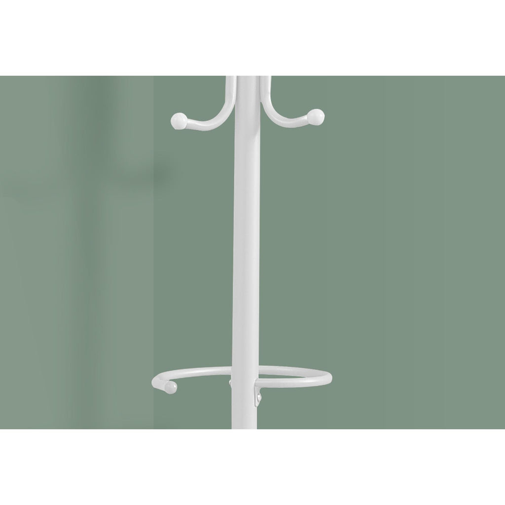 • This white metal free standing coat rack has a wide base to evenly distribute the weight