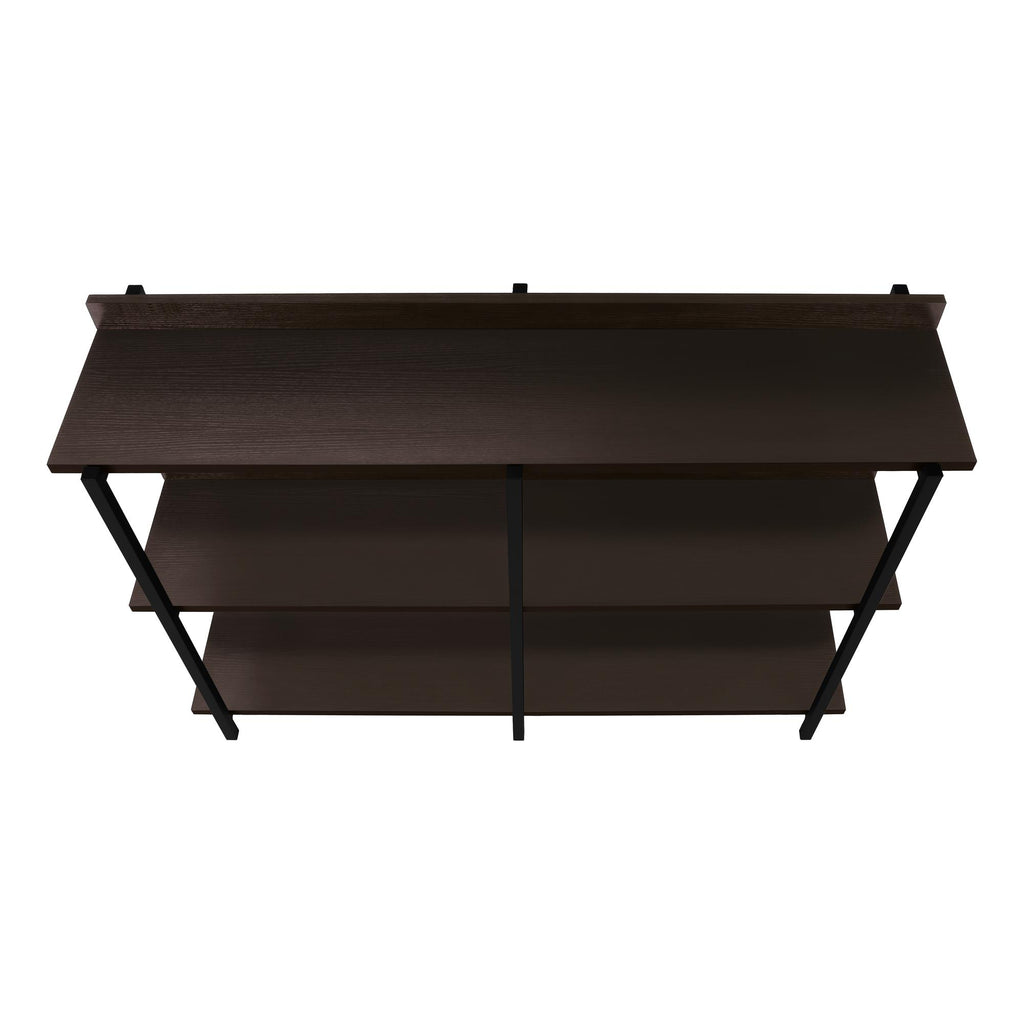 Proudly display prized possessions on this rectangular console table with 3-tier shelving. Underneath the long, narrow tabletop are shelves arranged... Proudly display prized possessions on this rectangular console table with 3-tier shelving. Underneath the long, narrow tabletop are shelves arranged on 2 levels. Distribute books, plants, and decorative items among the tabletop and shelves, which are in an elegant dark-brown espresso laminate finish. The sturdy metal frame in a contrasting black finish features clean lines and right angles for a modern look. With its narrow profile and generous display space, this versatile accent table with storage is ideal for a hallway, an entryway, or behind a sofa in a living room. View more