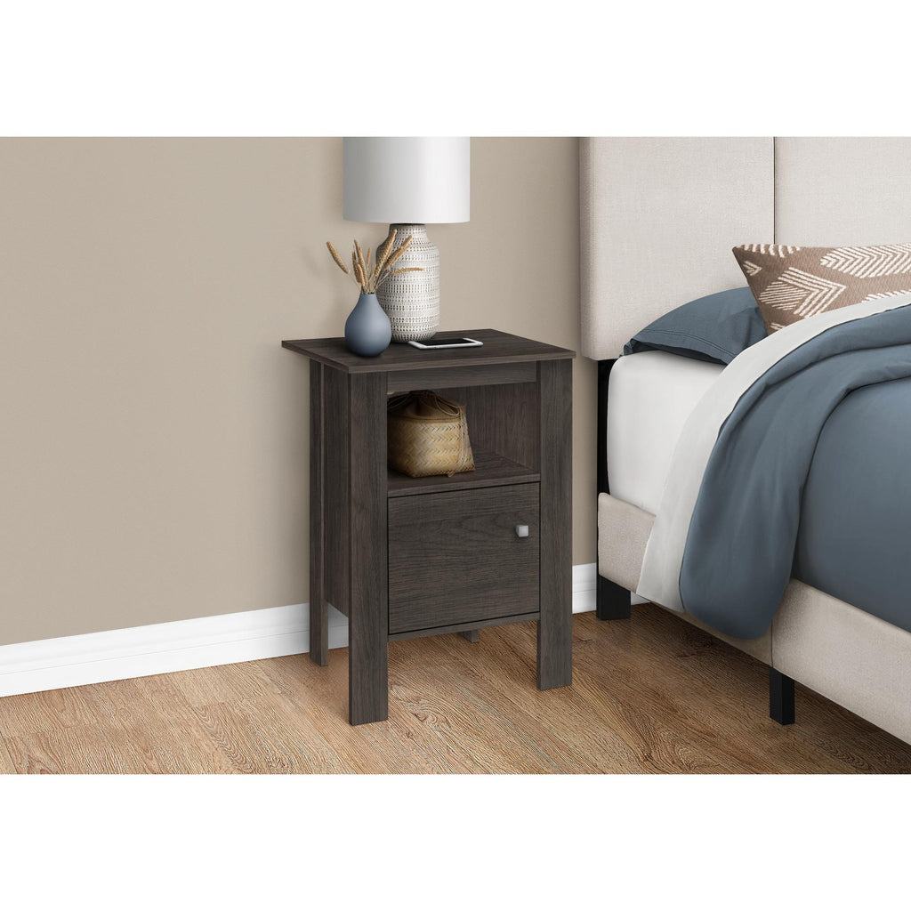 • With a touch of rustic, this practical side table features ample surface space thanks to an interior open shelf and closed cabinet with an elegant square silver knob