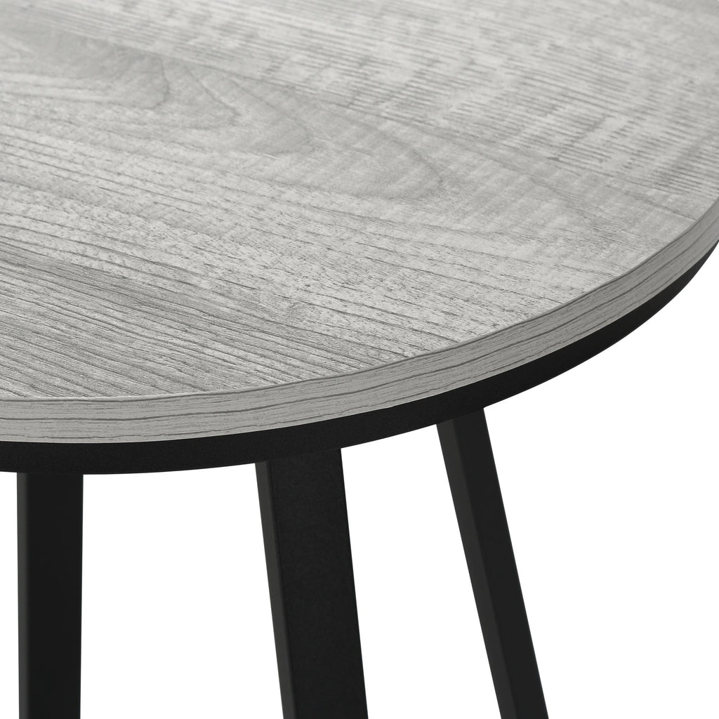 • With a sleek grey wood-look surface, this round top side table fits easily next to your sofa, chair or bed and sits slightly off the ground to prevent damage to your floor