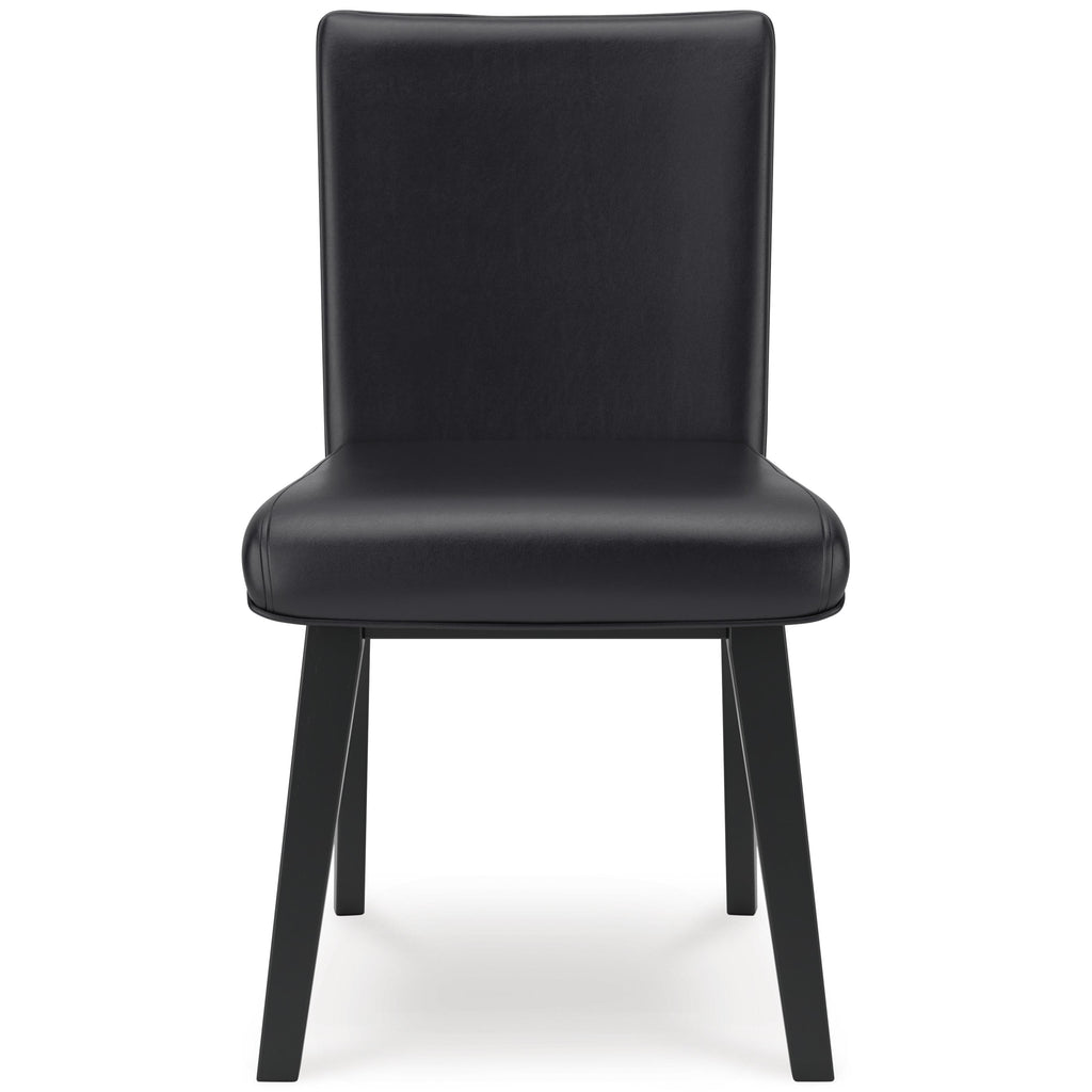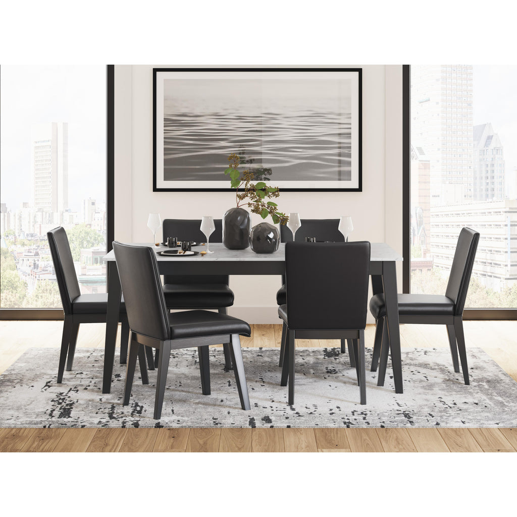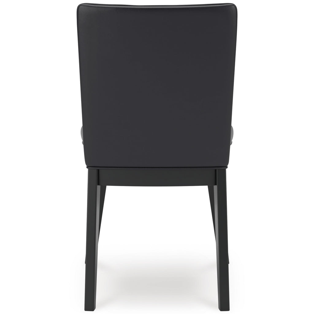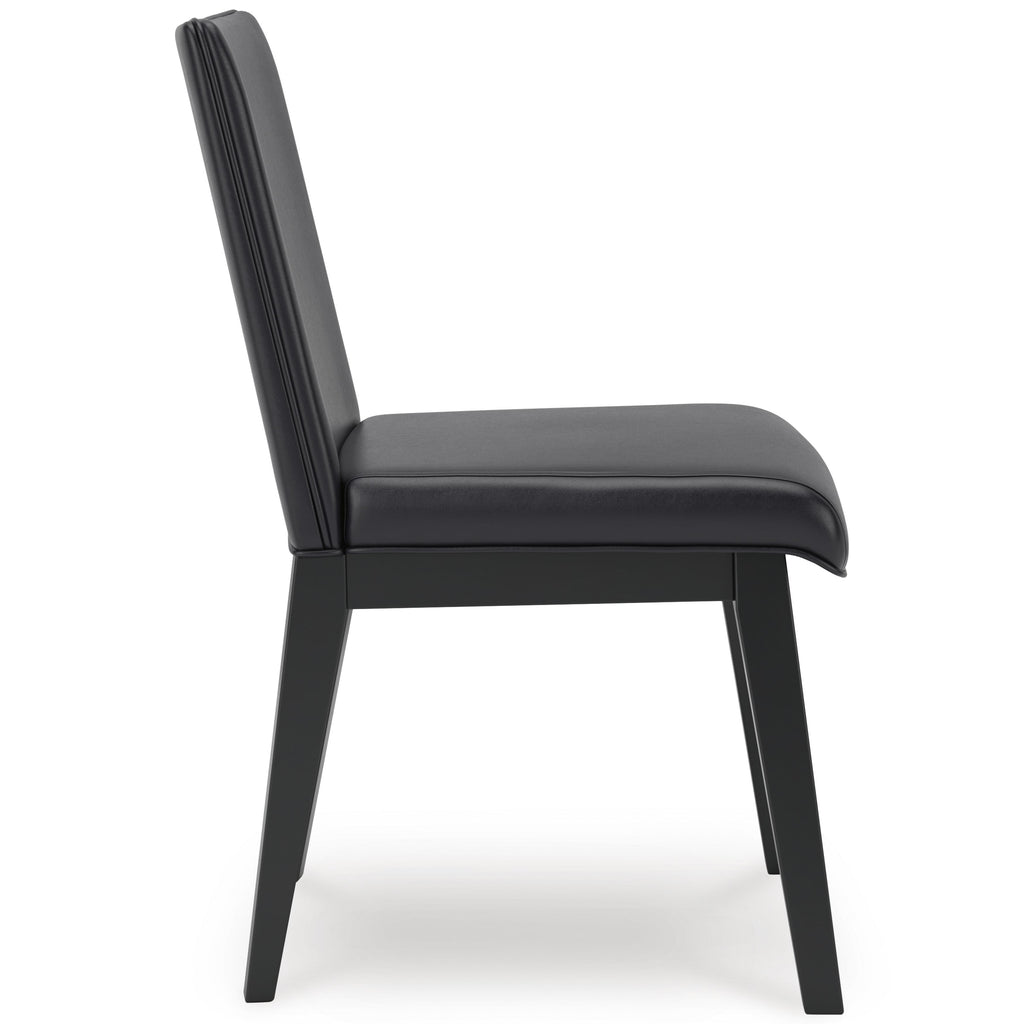| This dining chair exudes modern sophistication. Finished in a sleek black wood-tone with black faux leather upholstery for added comfort and style, it brings a beautifully balanced look to the table. A simply striking feast for the eyes—now your only worry is who to invite for dinner. |