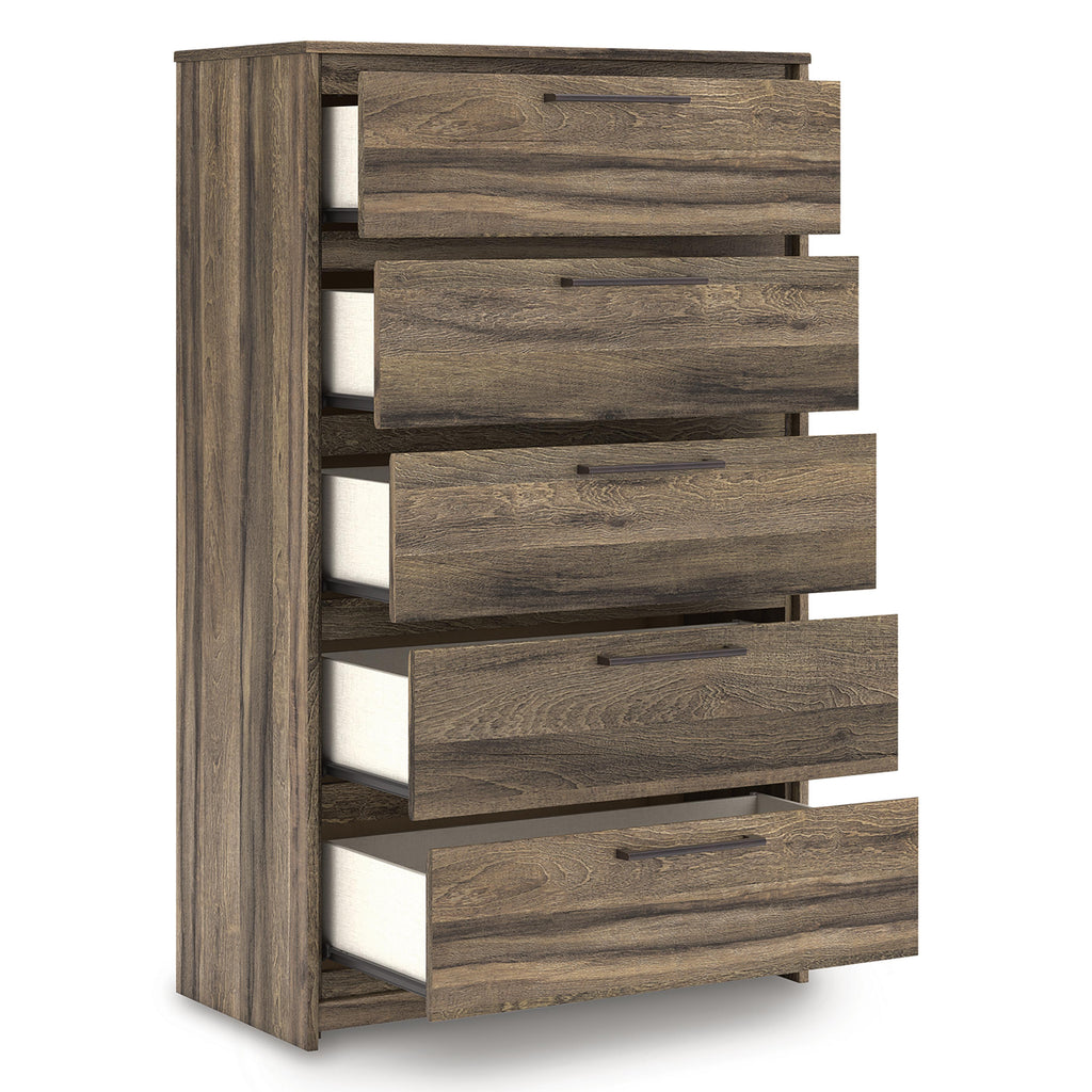 • Drawer interiors are lined with a faux linen laminate for a clean, finished look