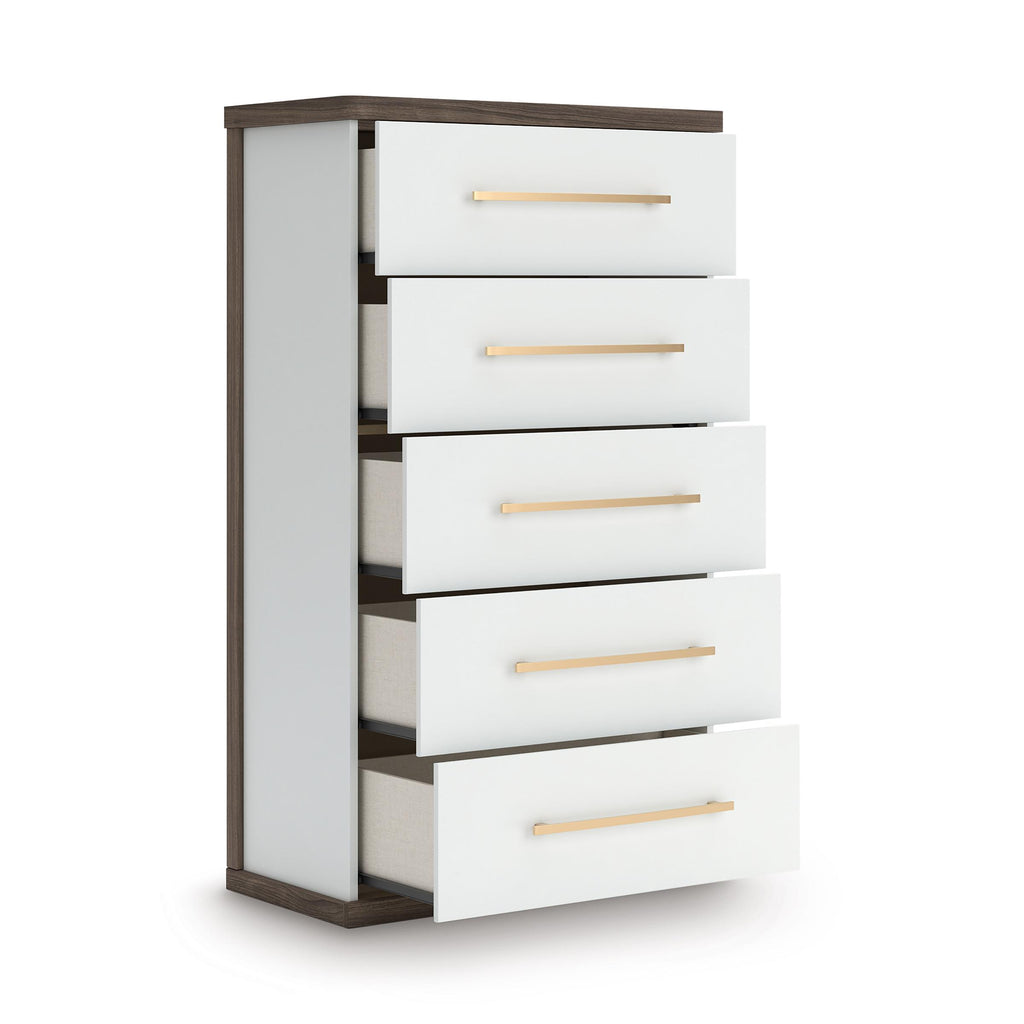 • Drawer interiors are lined with a faux linen laminate for a clean, finished look