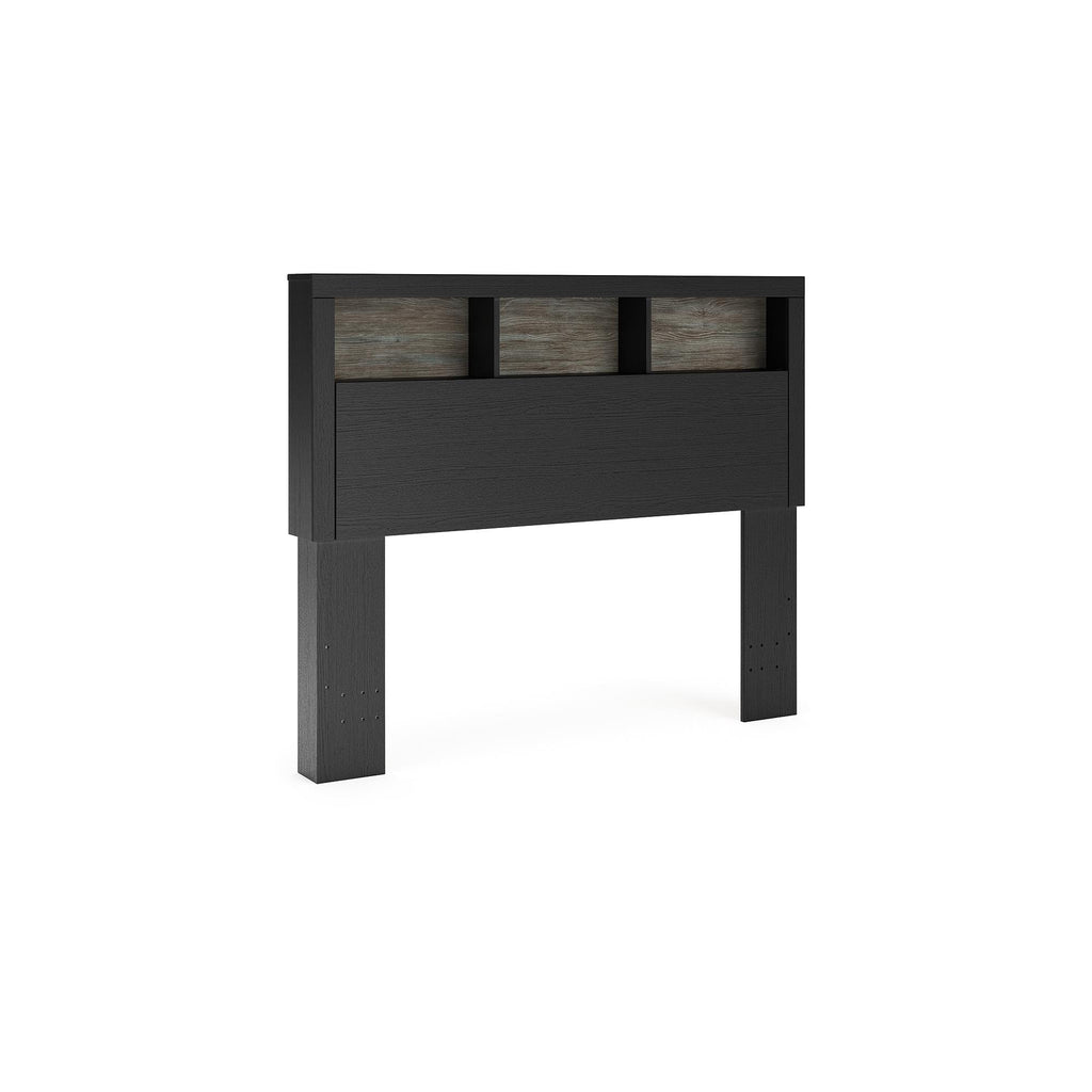 This full bookcase headboard evokes the tranquil vibe you long for in your dream destination. Its two-tone textured look marries... This full bookcase headboard evokes the tranquil vibe you long for in your dream destination. Its two-tone textured look marries a rustic gray finish and a matte black finish over replicated oak grain for neutral appeal. Both functional and versatile, its three open cubbies add space-saving storage, keeping favorite toys, books and other bedtime essentials within easy reach. View more