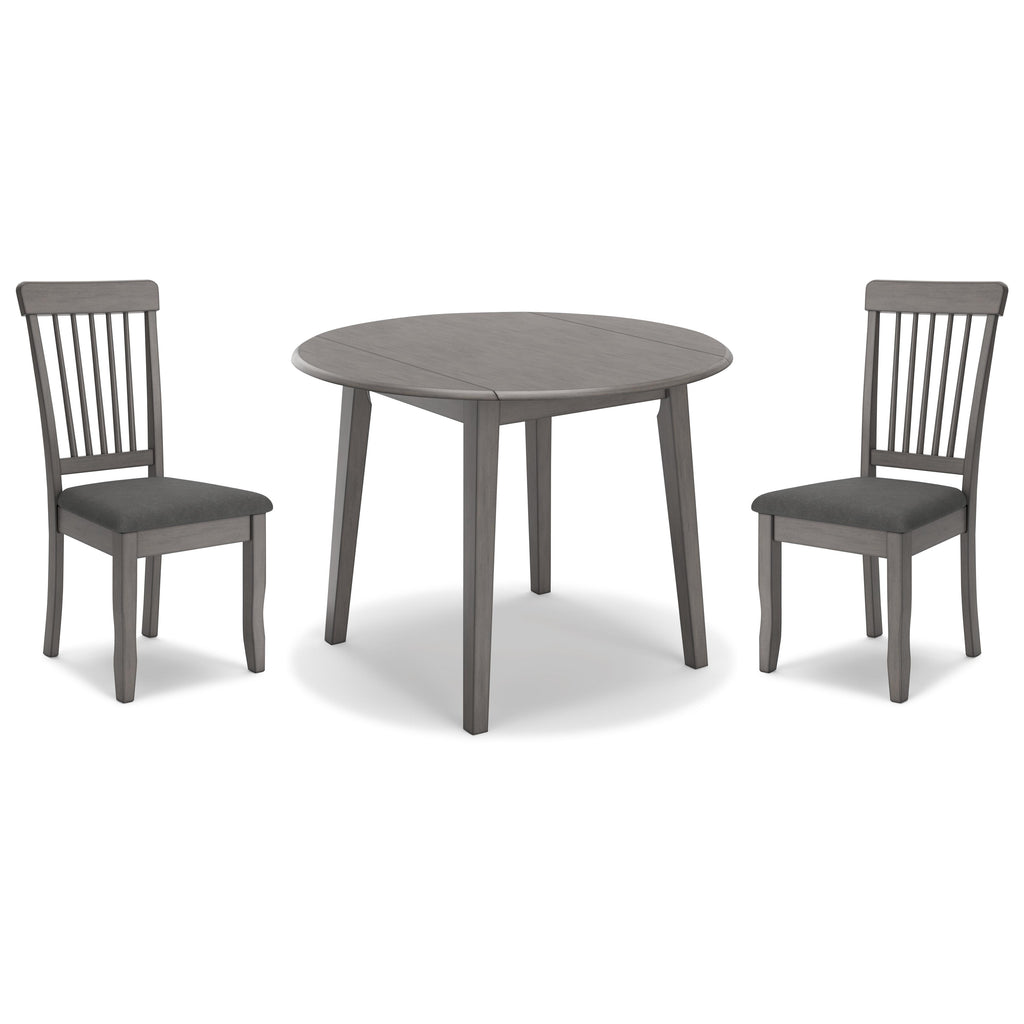 Serve up casual elegance with this dining room set. Its approachable character ushers a relaxed feel into kitchen nooks and small dining rooms. Two drop leaves provide just enough table space to accommodate the drop-in guest. Design details like a spindle back elevate the look, with contrasting gray hues lending a monochromatic, modern edge. Simply stylish, it’s an irresistible combination of everyday function and contemporary flair. This set includes a dining table and two side chairs.
