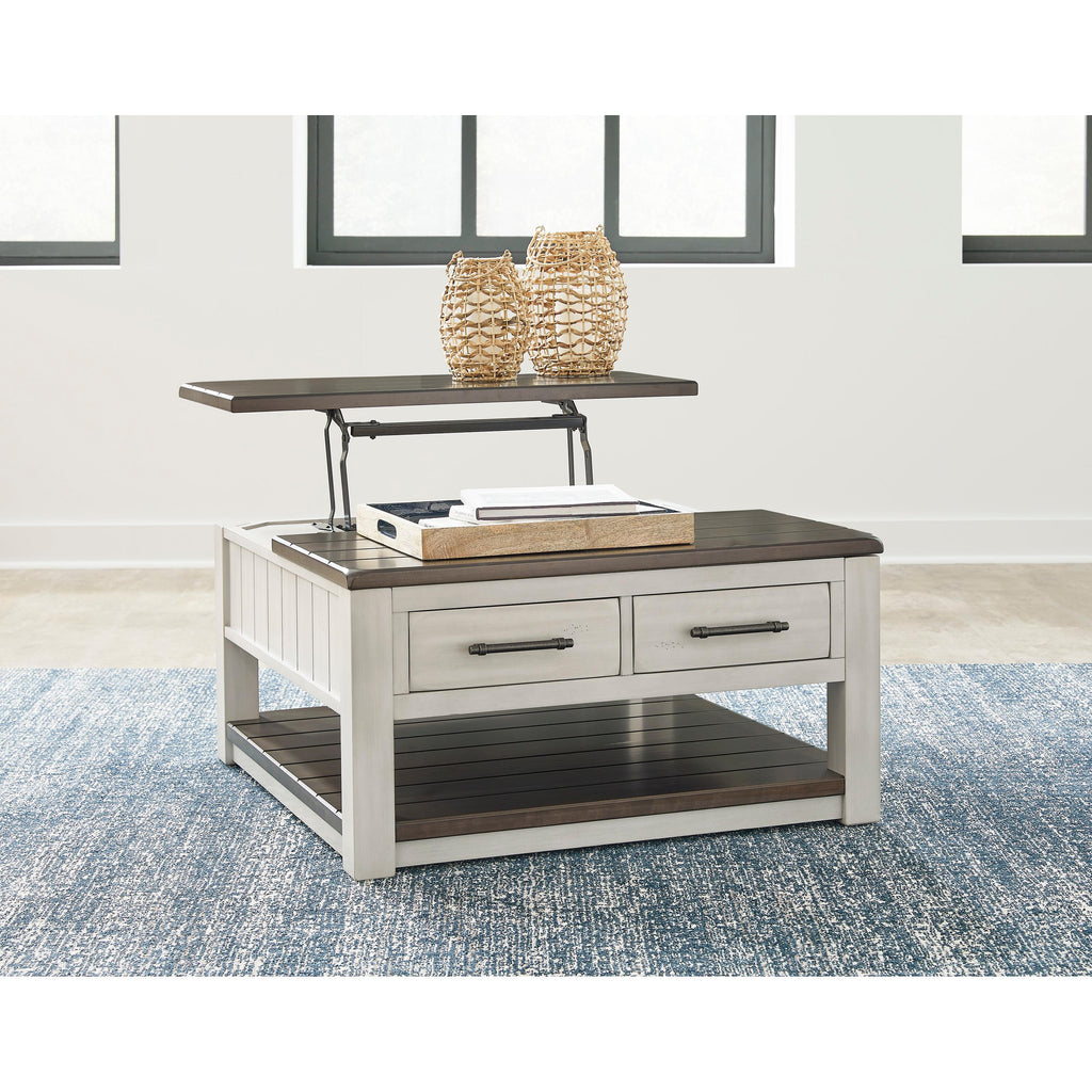 Make a farmhouse-inspired statement with this coffee table. Beautifully crafted to stand the test of time, the planked look and... Make a farmhouse-inspired statement with this coffee table. Beautifully crafted to stand the test of time, the planked look and clean two-tone finish lend a relaxing vintage feel. A clever lift-top section and spacious storage drawers double up on form and function. 2 Matching chairside end tables included. View more