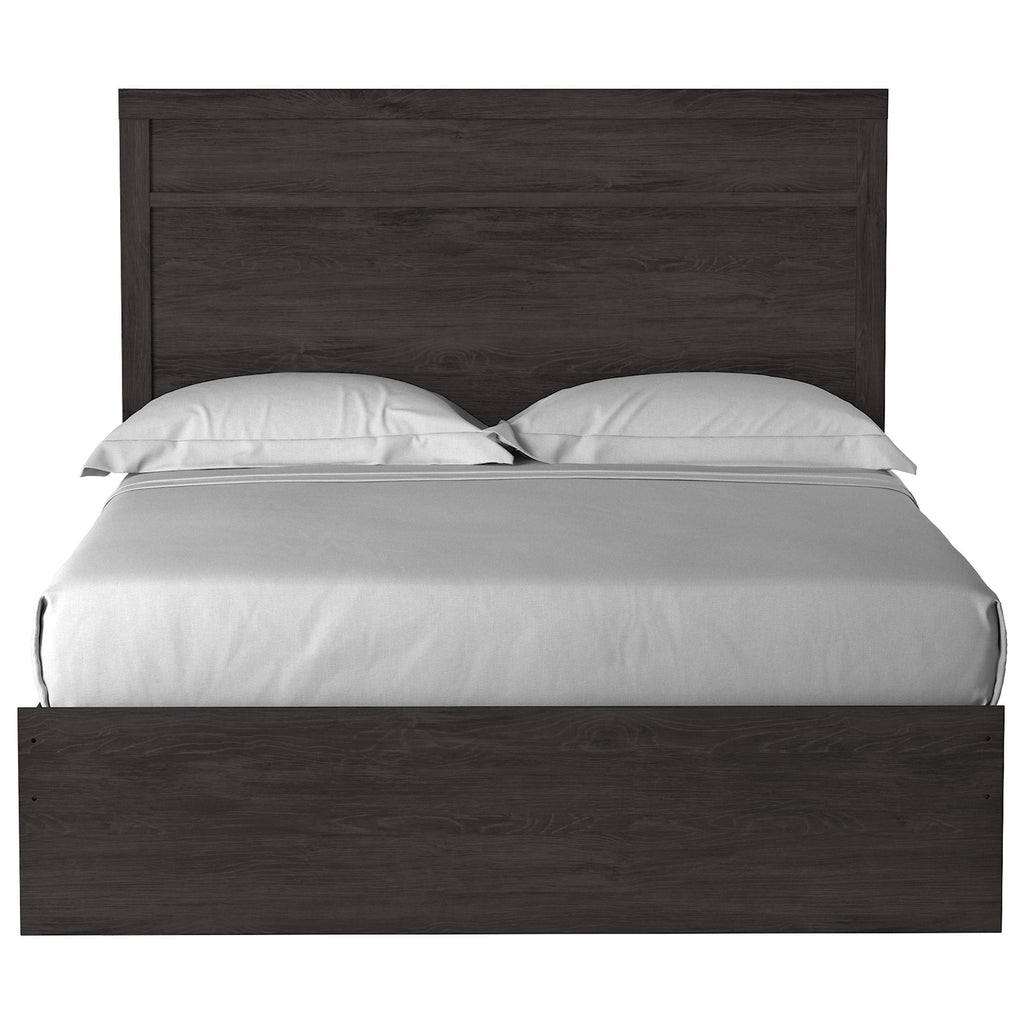 With its clean-lined look and modern attitude, this queen panel bed is a fresh style awakening. A warm charcoal hue over replicated oak grain easily complements other furniture finishes. The simple, unadorned profile is given depth and dimension with the addition of plank-style moulding on the headboard—proof that beauty lies in the details.