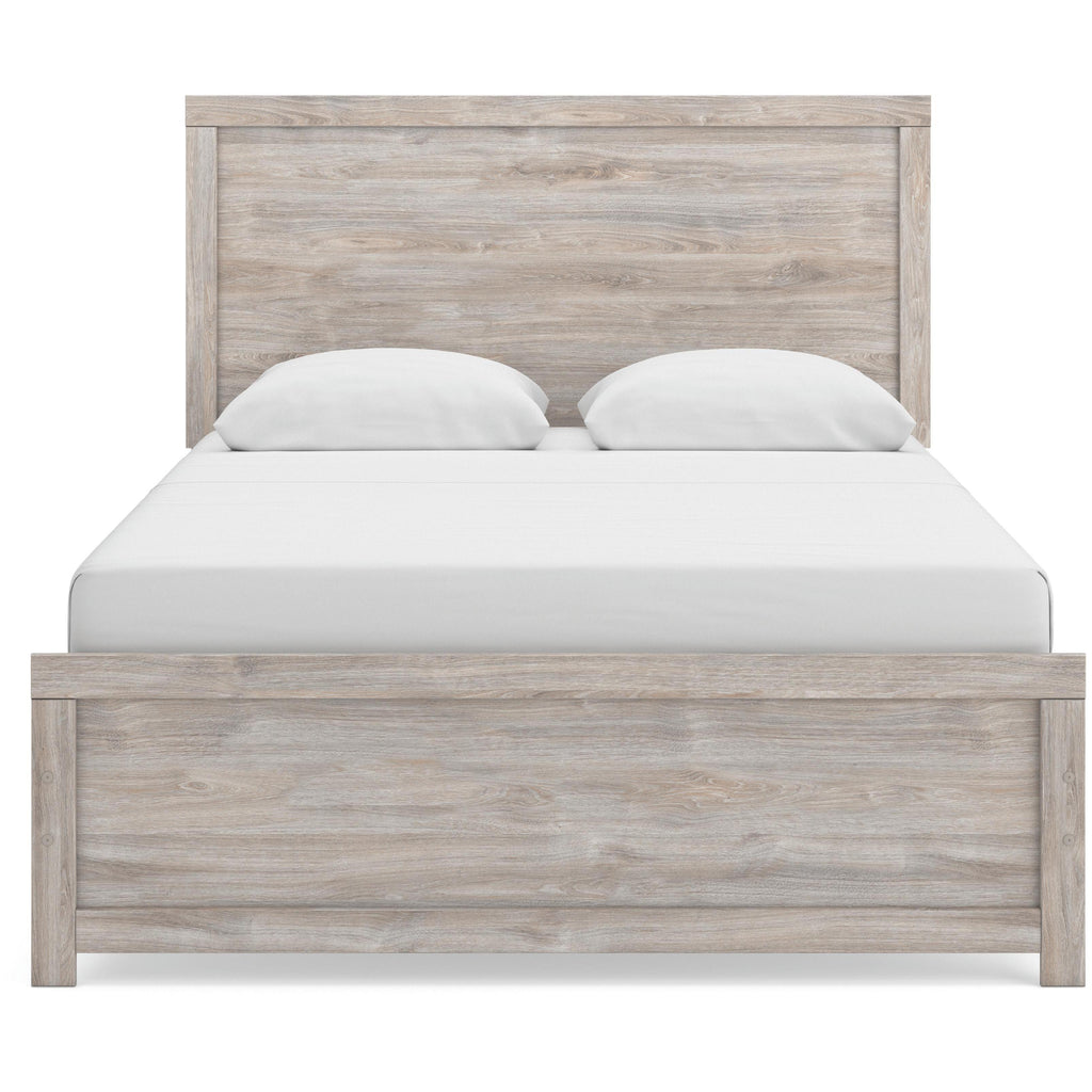 Bright and airy, this queen panel bed evokes the tranquil vibe you long for in your dream destination. The light gray finish over replicated oak grain whispers “inviting" and "relaxed.” You’ll love coming home to its laid-back aesthetic.