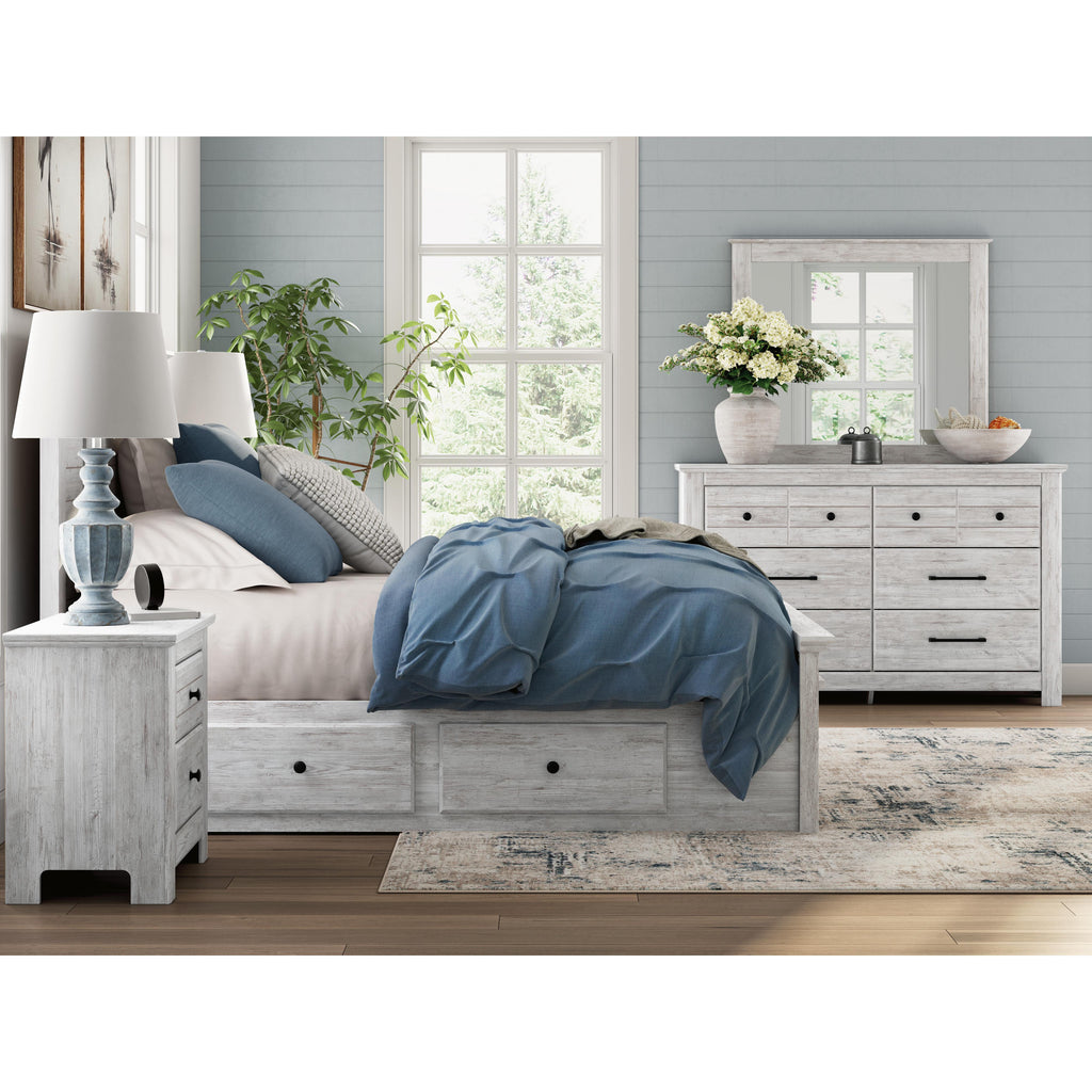 Looking to create a bedroom that feels airy and beautifully put together? This casually comfy full panel bed with storage... Looking to create a bedroom that feels airy and beautifully put together? This casually comfy full panel bed with storage is your perfect solution. Its clean lines, whitewash finish and replicated pine grain exude a charming cottage-inspired feel that brightens your restful retreat. Spacious drawers with dark bronze-tone handles stow away clothes and more. Now there’s a fresh take on country living we can get behind. View more