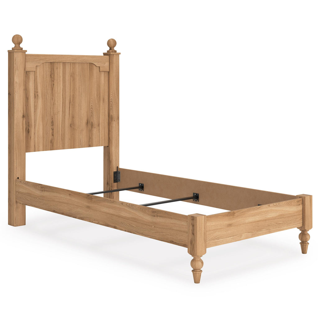 Country rustic. Vintage inspired. However you see it, you’re sure to be charmed by this twin panel bed and its relaxed mix of picturesque aesthetics. A gracefully shaped rail brings dimension to the headboard, while decorative ball tops and turned legs adorn the silhouette in quaint fashion. A warm oak grain finish enhances the bed's air of easygoing elegance, letting you drift away to a simpler time and place. Boxspring required for this bed.