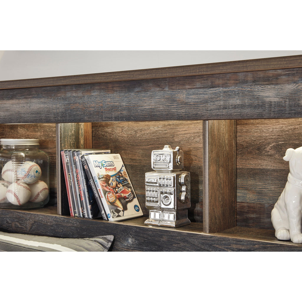 • Brown rustic finish with burnt orange and teal accents in a replicated wood grain with authentic touch