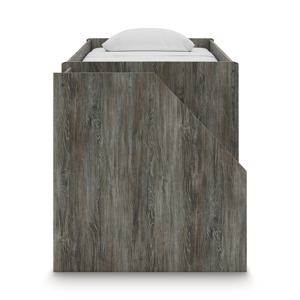 • Rustic warm gray finish over replicated oak grain with authentic touch
