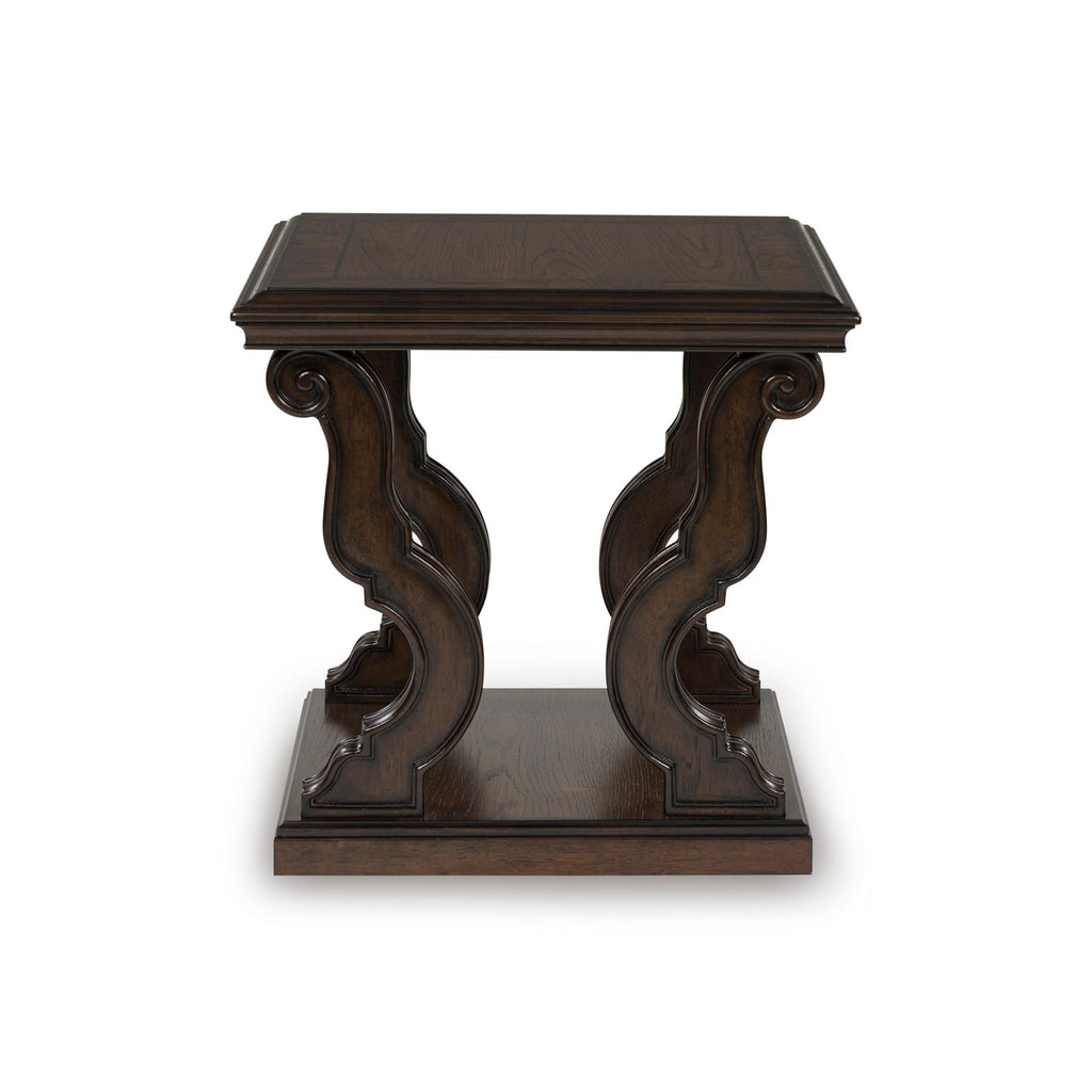 Lavish, luxurious living is within reach when you add this end table to your living room. Recalling a classic sense of refinement, its elegant scrolled legs make a beautifully bold statement. Ornate details on the apron add an air of opulence to the regal dark brown finish. The look is timeless. The feel? Right at home.