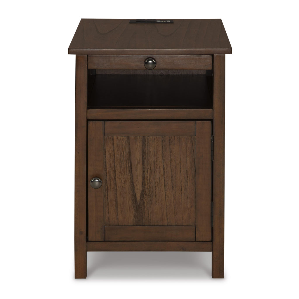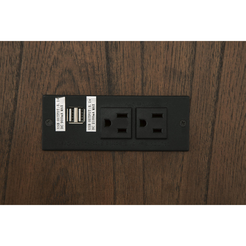 • Table features storage cabinet, open cubby shelf and pull-out tray