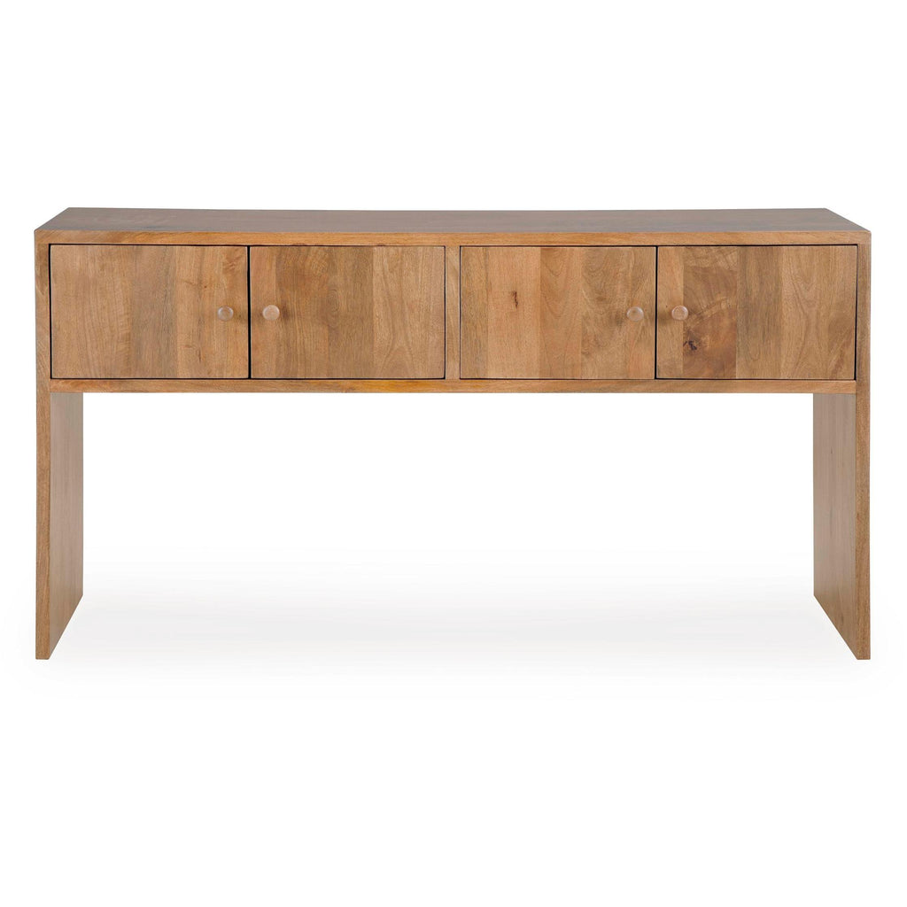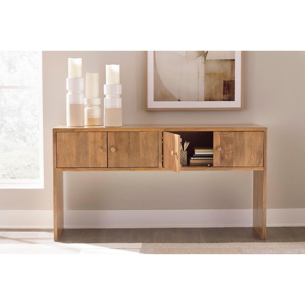 This console table takes casual design to a whole new level. Solid mango wood is adorned with a multi-step light... This console table takes casual design to a whole new level. Solid mango wood is adorned with a multi-step light brown finish that enhances its natural character. Clean, contemporary lines are paired with an attractive peg and dovetail detail for a unique artistic style, keeping this piece on the cutting edge of cool. Two double-door cabinets with coordinating knobs are perfect for storing your small items neatly out of sight. View more