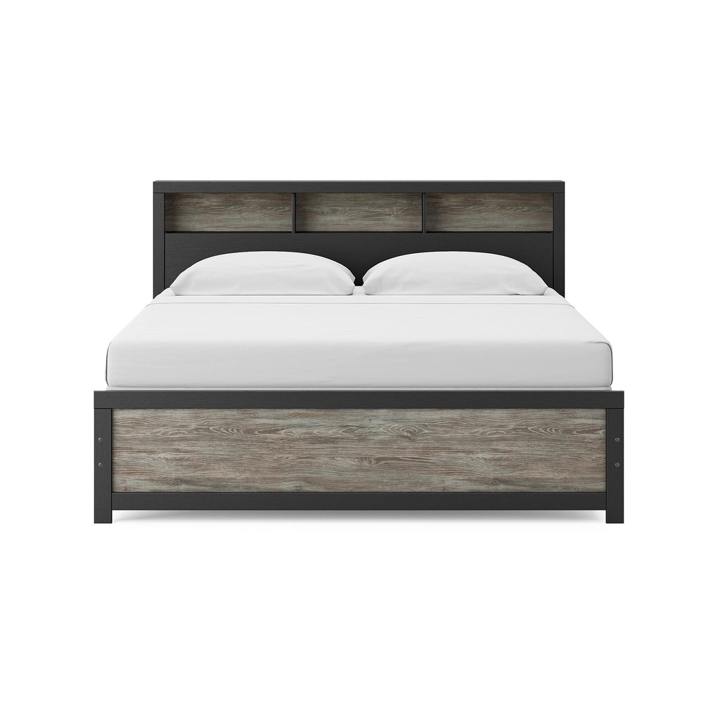 Comfy, functional and versatile, this king bookcase bed evokes the tranquil vibe you long for in your dream destination. Its... Comfy, functional and versatile, this king bookcase bed evokes the tranquil vibe you long for in your dream destination. Its two-tone textured look marries a rustic gray finish and a matte black finish over replicated oak grain for neutral appeal. Three open cubbies in the headboard add space-saving storage, keeping favorite reads, bedtime essentials and so much more within easy reach. View more