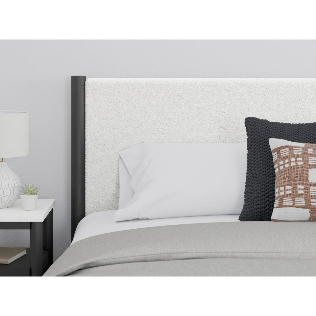 This king upholstered panel bed reflects your sophisticated approach to boho style. Crafted with both form and function in mind,... This king upholstered panel bed reflects your sophisticated approach to boho style. Crafted with both form and function in mind, its fresh white fabric beautifully contrasts the matte black finish. The versatile design suits all-neutral spaces or blends with your favorite pops of color. It’s inviting, yet posh. Luxe, yet laid-back. With this bed, your free-spirited vibe meets modern design. View more