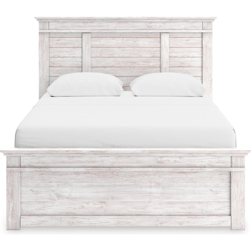 Looking to create a bedroom that feels airy and beautifully put together? This casually comfy king panel storage bed is your perfect solution. Its clean lines, whitewash finish and replicated pine grain exude a charming cottage-inspired feel that brightens your restful retreat. Spacious drawers with dark bronze-tone handles stow away clothes and more. Now there’s a fresh take on country living we can get behind.