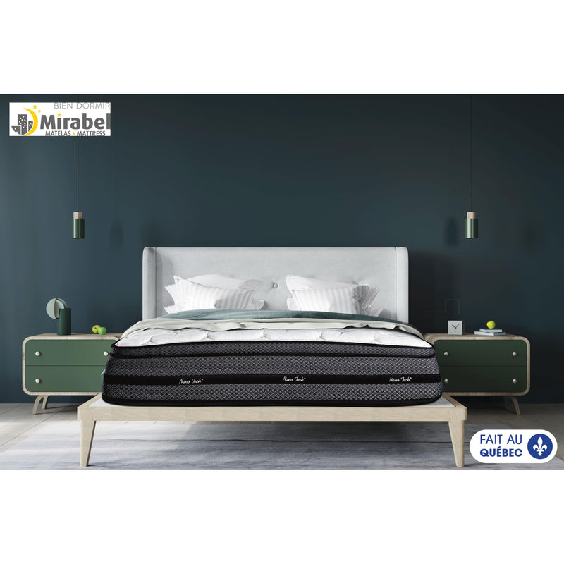 Matelas confort moelleux à base de résine naturelle de plantes procurant plus de fraîcheur tout au long de votre sommeil. Tissu Simetry grey™ offrant plus de fraîcheur au contact du corps tout au long de la nuit. 3/4" de laine pure aérante. 3/4" de mousse Gel non thermosensible, flexible, fraîche et souple. Cette luxueuse mousse s'adapte parfaitement aux formes du corps et élimine les points de pression. 1 1/2" de mousse ondulée. Une rangée de 995 ressorts ensachés de même que deux rangées de 1131 ressorts Nano de 1" répartis en 7 zones de fermeté, offrant un meilleur confort. 3/8" isolant feutre et une toile de maintien pour plus de fermeté. Conçu dans un caisson de mousse, ce matelas vous offre un confort équilibré sur toute sa surface. Produit fait au QuébecDisponibilité du produit