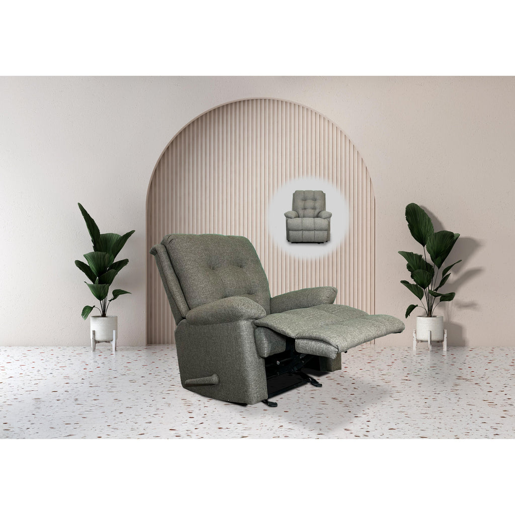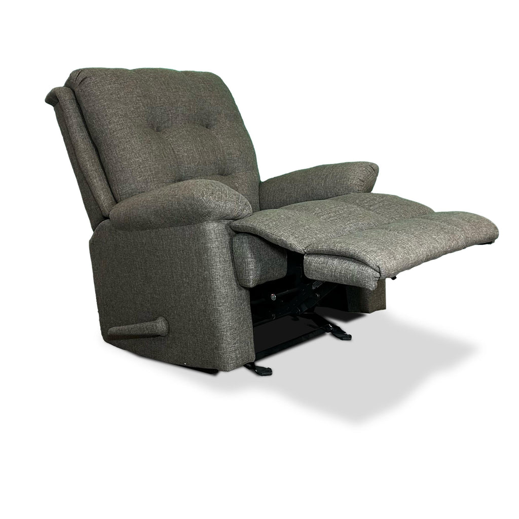 Alliez confort et détente avec ce fauteuil Relaxon/Elran à mécanisme manuel. Son dossier capitonné et son tissu gris durable en... Alliez confort et détente avec ce fauteuil Relaxon/Elran à mécanisme manuel. Son dossier capitonné et son tissu gris durable en font un choix à la fois élégant et relaxant. Fabriqué au Québec Voir plus