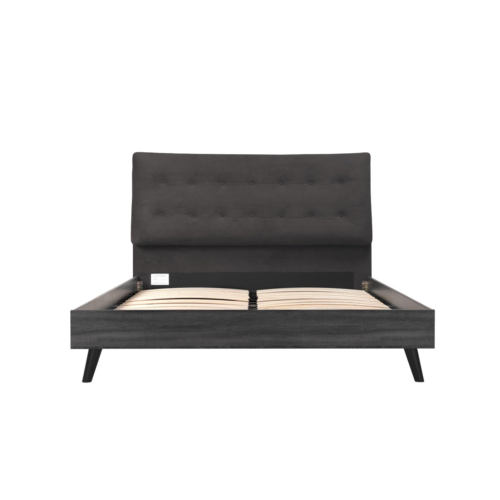 • Le pied de lit et les traverses sont en stratifié 3D en faux bois gris pour compléter la tête de lit rembourrée