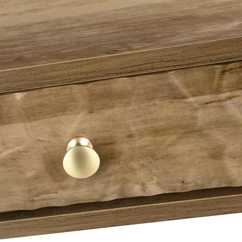 • Les détails de design remarquables comprennent : Une texture unique et ondulée sur la façade du tiroir; des détails dorés sur les pattes rondes et élégantes en bois massif; une poignée en forme de bouton en métal brossé avec finition dorée; des glissières de tiroir en métal; et un intérieur fini dans tous les espaces de rangement