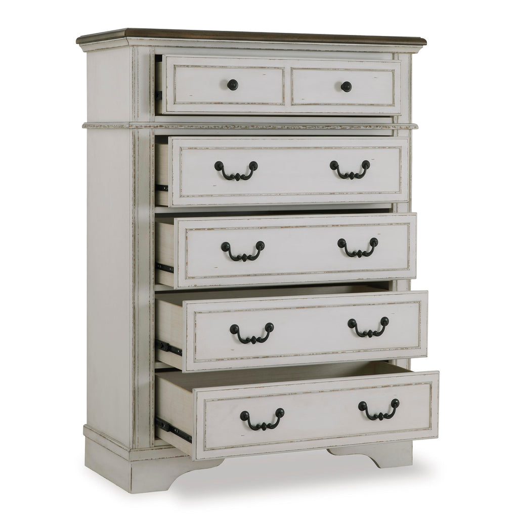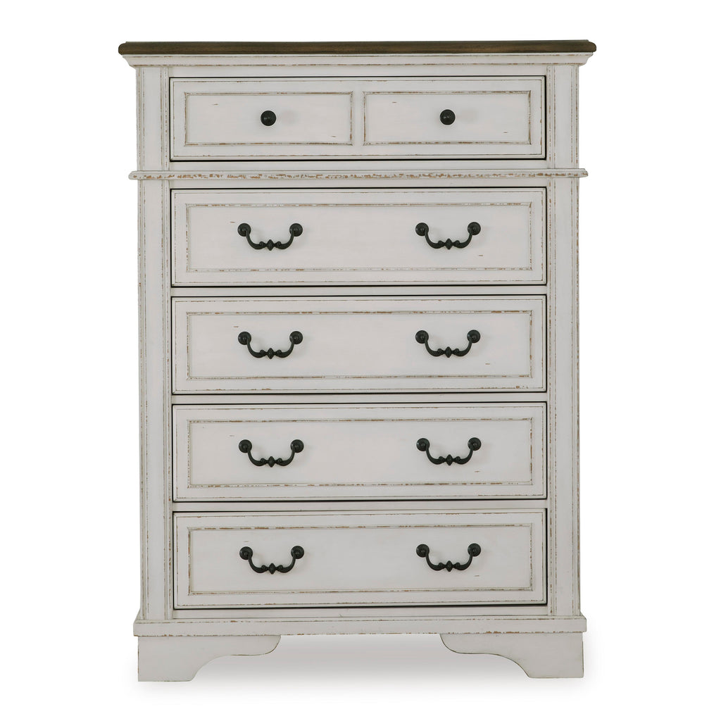 | Conception traditionnelle. Attrait décontracté. Vous pouvez tout avoir avec cette commode. Une esthétique bicolore décontractée fusionne avec des façades de tiroir profilées ornées et des pilastres pour donner à la pièce distinctive une allure qui lui est propre. Les grands tiroirs enbouvetés de qualité et la quincaillerie bronze foncé reflètent le souci du détail de l’intérieur. | |