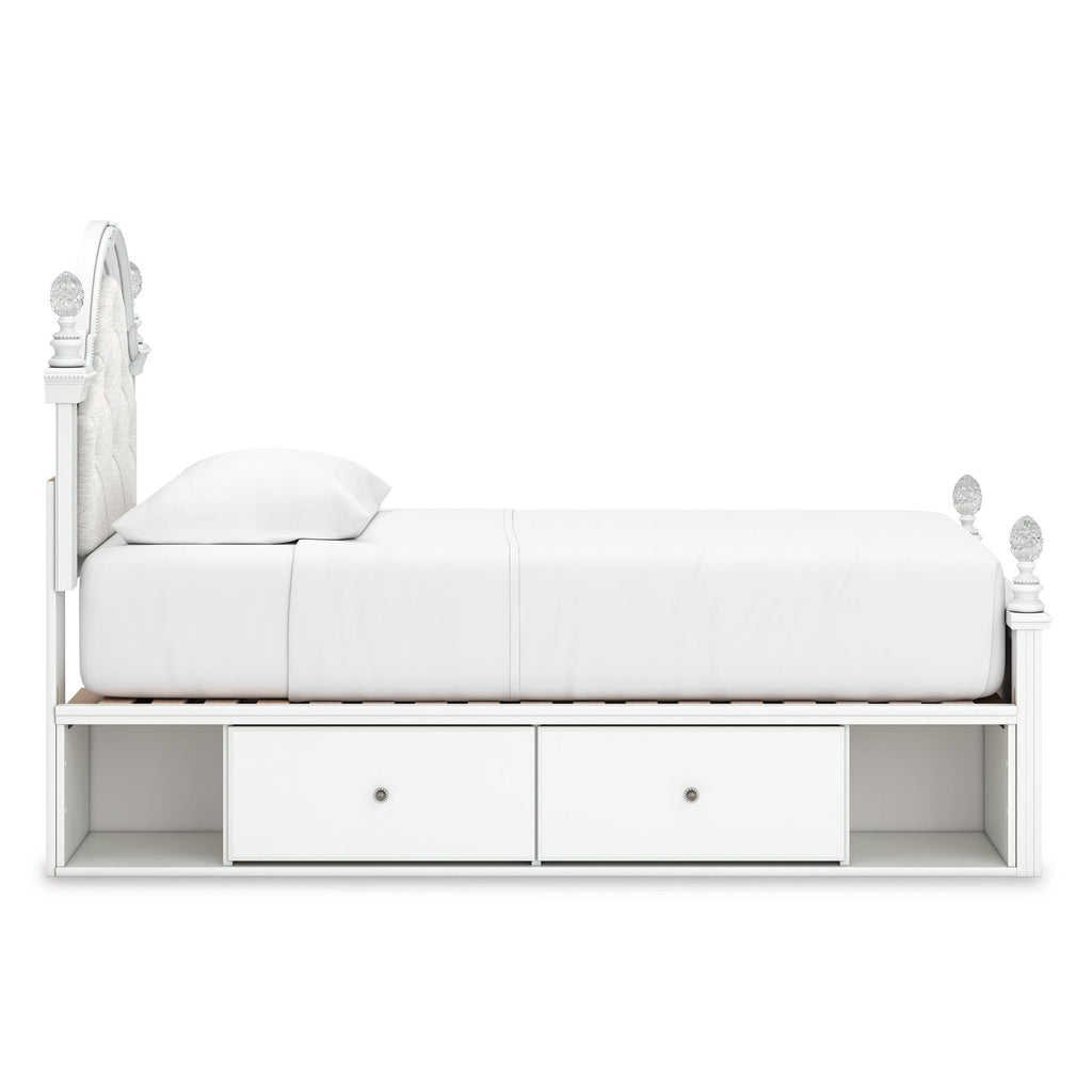 Digne d’une princesse. Ce lit de rangement à panneaux doubles rembourré s’accorde avec une finition blanche mate et charmante avec des perles ornées et une somptueuse sellerie boutonnée — parfaite pour votre fille féminine. De larges tiroirs de rangement rangent soigneusement les essentiels de la chambre. Des boules décoratives et un éclairage DEL multicolore dans la tête de lit sont les touches clés pour faire sentir votre petit comme un roi.