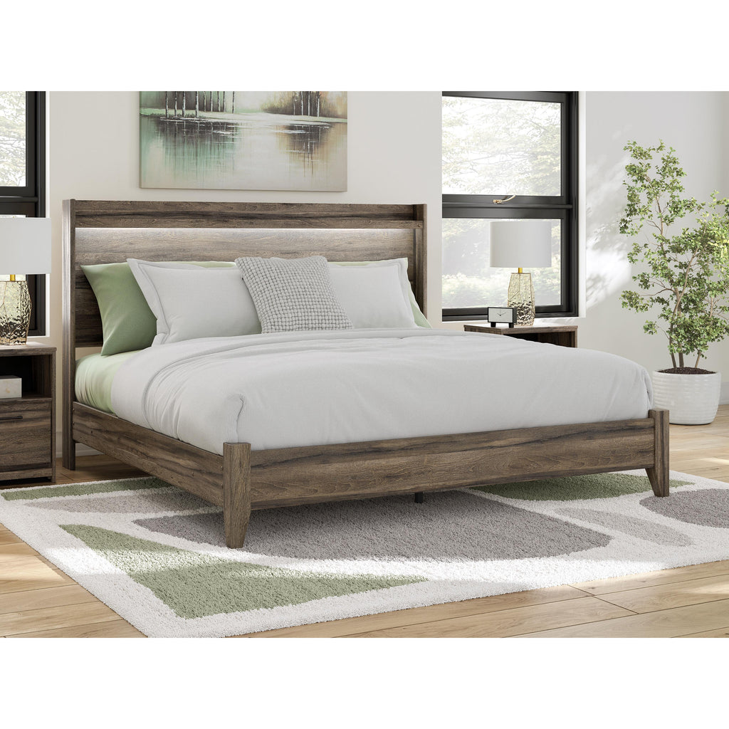 Reposez-vous dans le style décontracté et frais de ce lit king à panneau. Une finition brune vieillie et un éclairage... Reposez-vous dans le style décontracté et frais de ce lit king à panneau. Une finition brune vieillie et un éclairage DEL froid créent une ambiance décontractée, créant l’ambiance de votre retraite reposante. Le design épuré du lit offre un look sans tracas. Voir plus